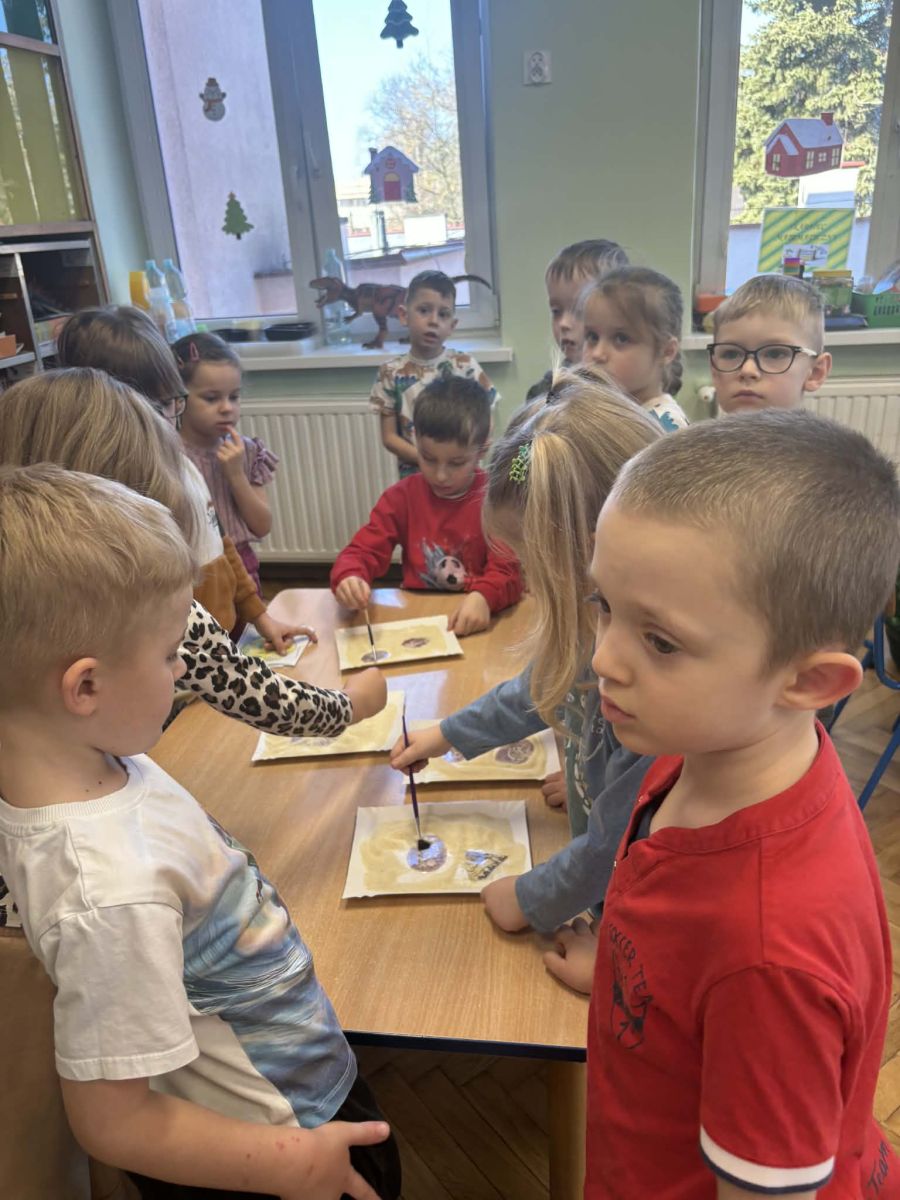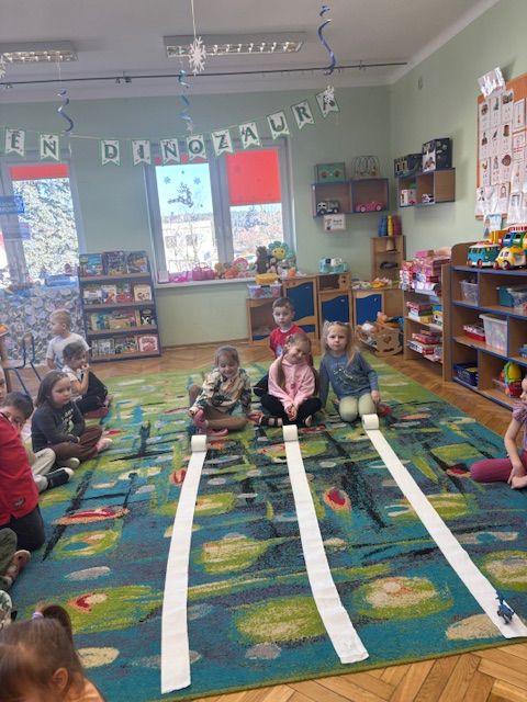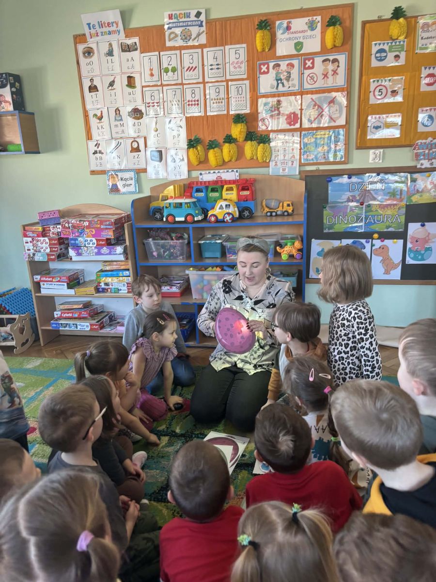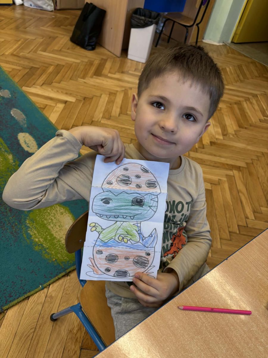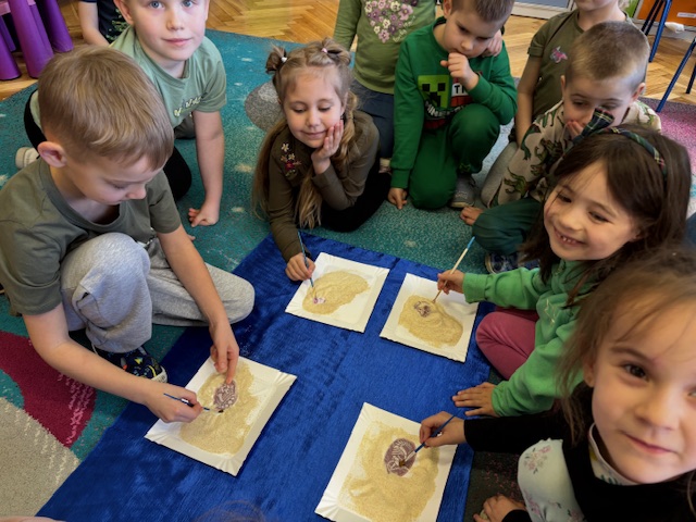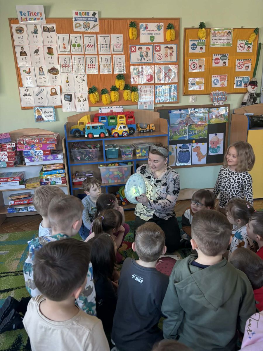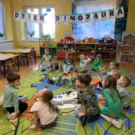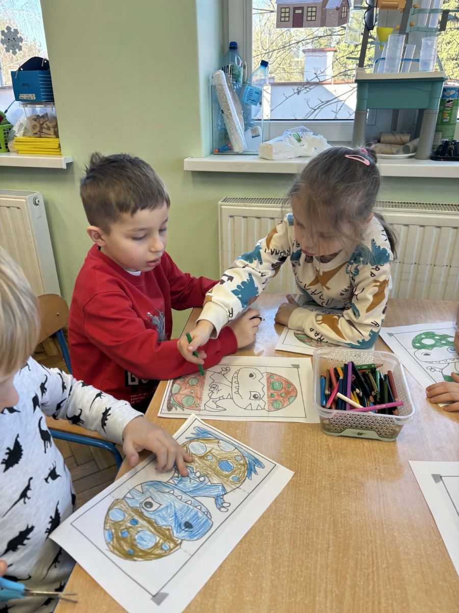 Najstarsze przedszkolaki rozpoczęły dzień od poznania wiersza „Dinozaury” autorstwa Agaty Dziechciarczyk oraz rozmowy o zawodzie paleontologa. Dowiedziały się, na czym polega praca badaczy odkrywających ślady przeszłości. Podczas zabaw muzyczno-ruchowych („Dinozaur się budzi”, „Dinozaurze kroki”, „Uciekamy przed wulkanem”, „Dino-stopy”) doskonaliły poczucie rytmu, refleks i koordynację ruchową. Wspólne układanie puzzli na wyścigi sprzyjało współpracy, a ćwiczenia gimnastyczne inspirowane ruchem dinozaurów rozwijały sprawność fizyczną. Dzieci uczestniczyły również w pracach wykopaliskowych, zabawach matematycznych (liczenie, porównywanie, segregowanie) oraz wykonały twórczą pracę plastyczną „Narodziny dinozaura”.