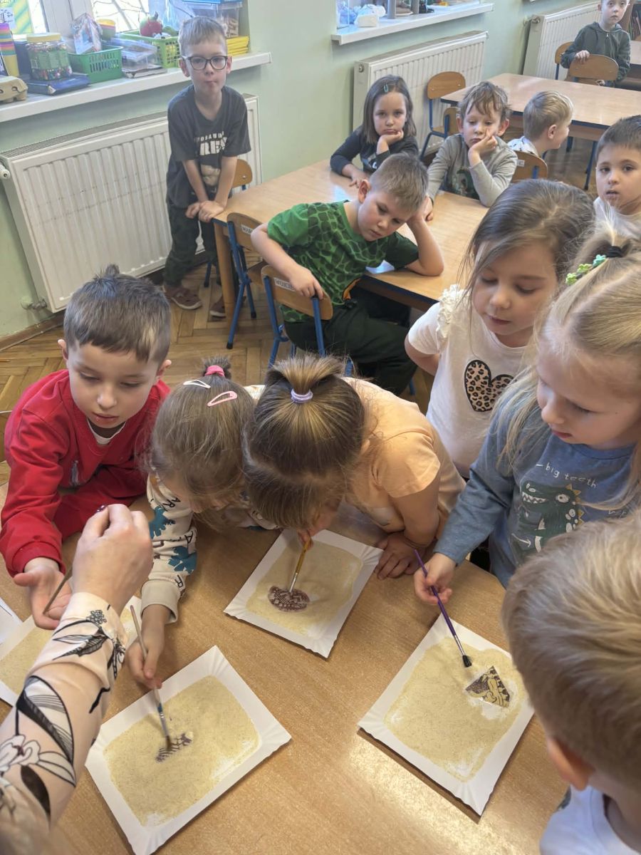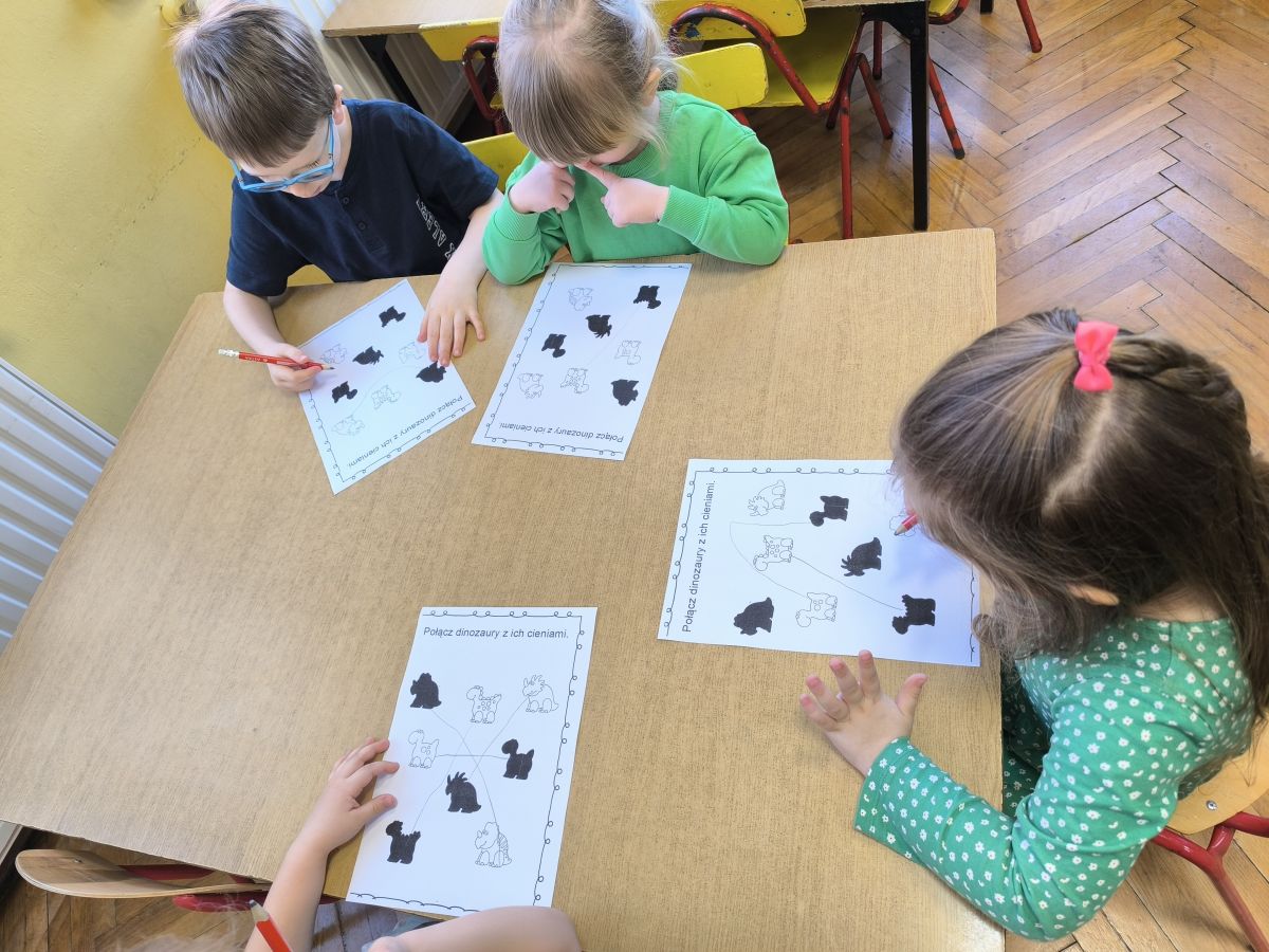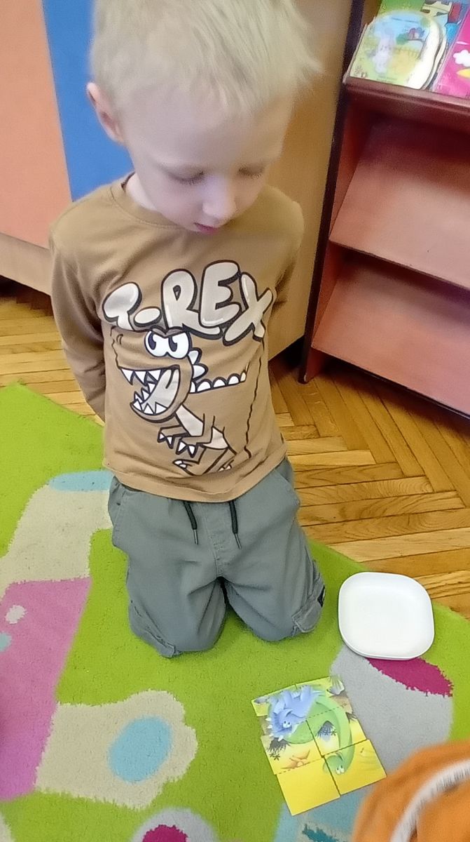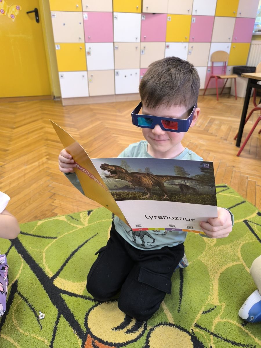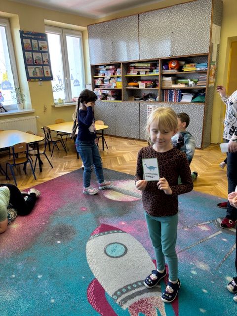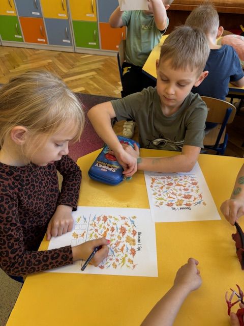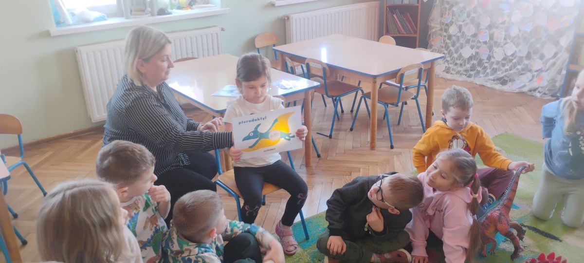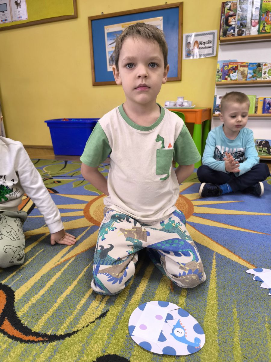 Najstarsze przedszkolaki rozpoczęły dzień od poznania wiersza „Dinozaury” autorstwa Agaty Dziechciarczyk oraz rozmowy o zawodzie paleontologa. Dowiedziały się, na czym polega praca badaczy odkrywających ślady przeszłości. Podczas zabaw muzyczno-ruchowych („Dinozaur się budzi”, „Dinozaurze kroki”, „Uciekamy przed wulkanem”, „Dino-stopy”) doskonaliły poczucie rytmu, refleks i koordynację ruchową. Wspólne układanie puzzli na wyścigi sprzyjało współpracy, a ćwiczenia gimnastyczne inspirowane ruchem dinozaurów rozwijały sprawność fizyczną. Dzieci uczestniczyły również w pracach wykopaliskowych, zabawach matematycznych (liczenie, porównywanie, segregowanie) oraz wykonały twórczą pracę plastyczną „Narodziny dinozaura”.
