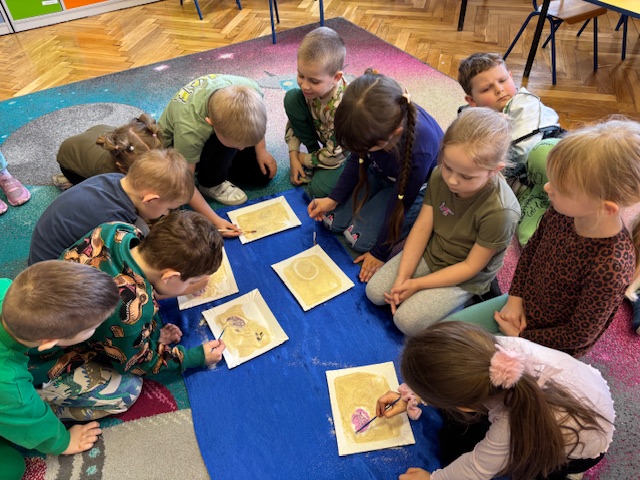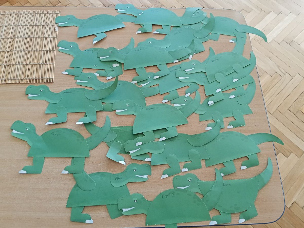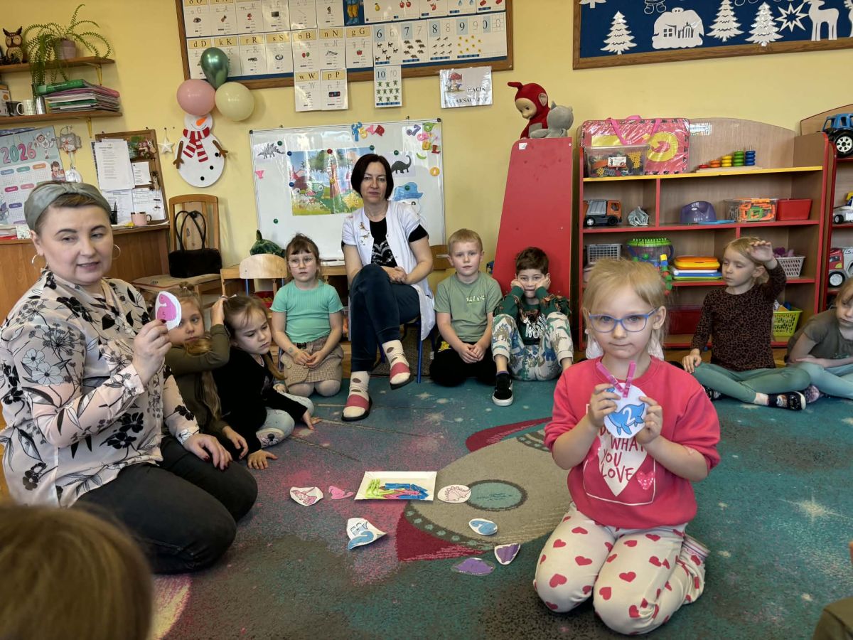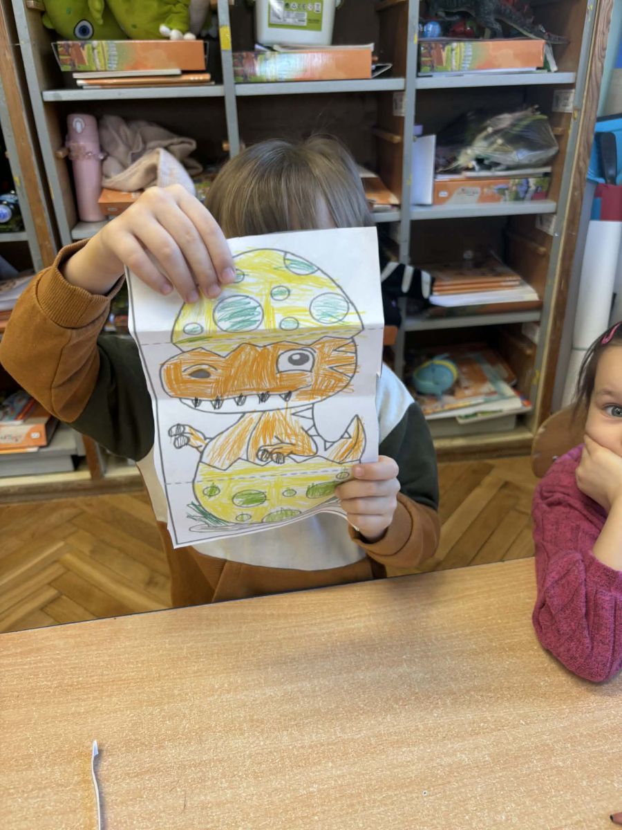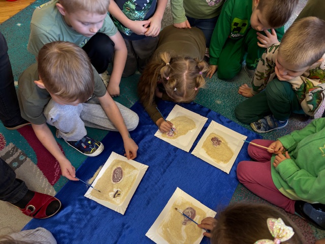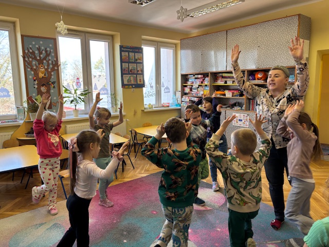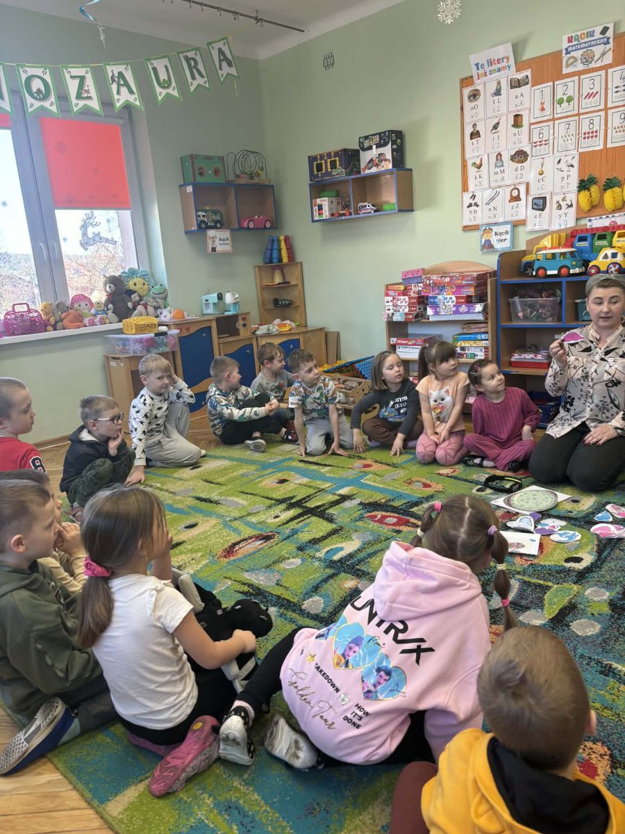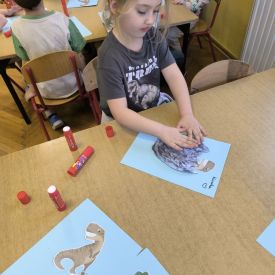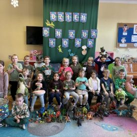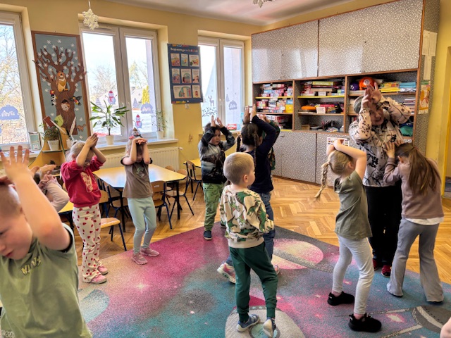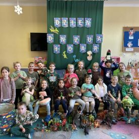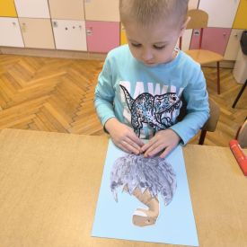 Najstarsze przedszkolaki rozpoczęły dzień od poznania wiersza „Dinozaury” autorstwa Agaty Dziechciarczyk oraz rozmowy o zawodzie paleontologa. Dowiedziały się, na czym polega praca badaczy odkrywających ślady przeszłości. Podczas zabaw muzyczno-ruchowych („Dinozaur się budzi”, „Dinozaurze kroki”, „Uciekamy przed wulkanem”, „Dino-stopy”) doskonaliły poczucie rytmu, refleks i koordynację ruchową. Wspólne układanie puzzli na wyścigi sprzyjało współpracy, a ćwiczenia gimnastyczne inspirowane ruchem dinozaurów rozwijały sprawność fizyczną. Dzieci uczestniczyły również w pracach wykopaliskowych, zabawach matematycznych (liczenie, porównywanie, segregowanie) oraz wykonały twórczą pracę plastyczną „Narodziny dinozaura”.