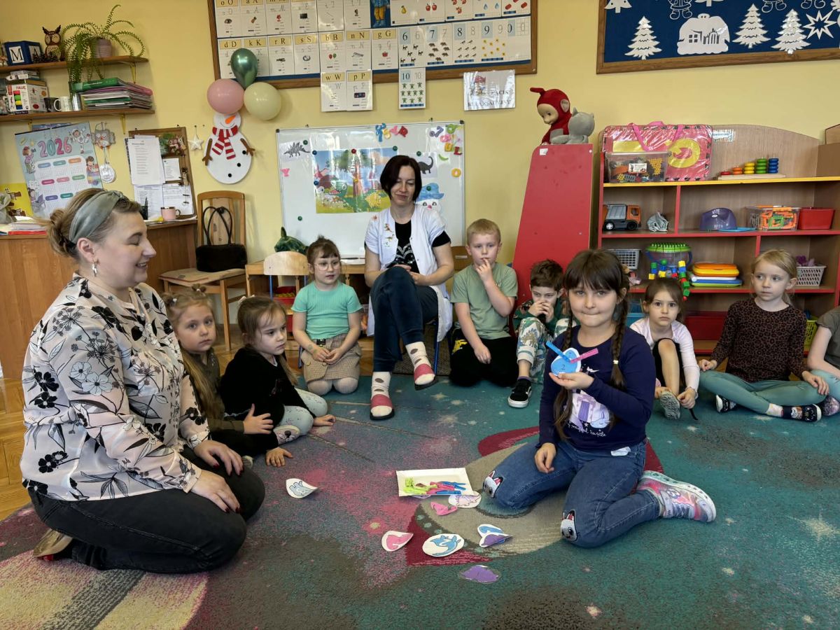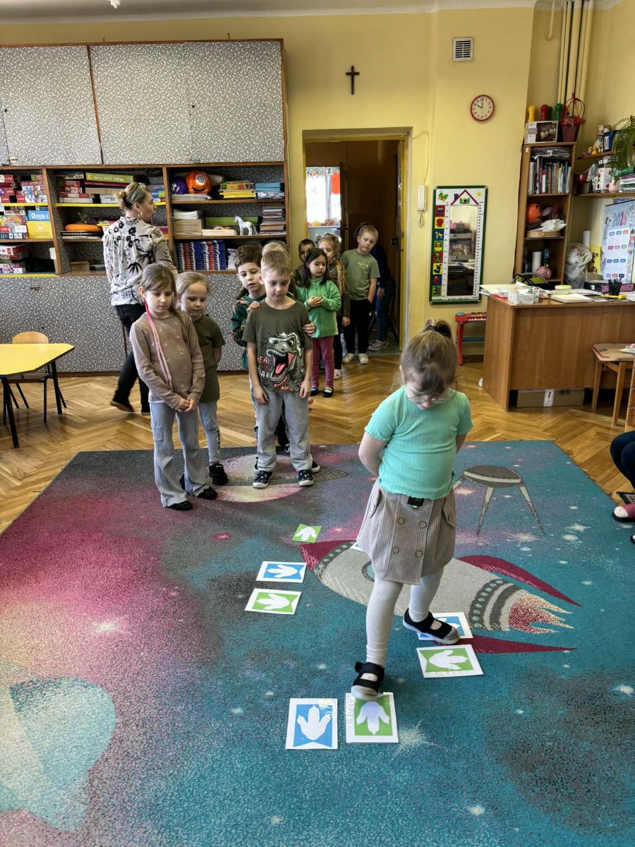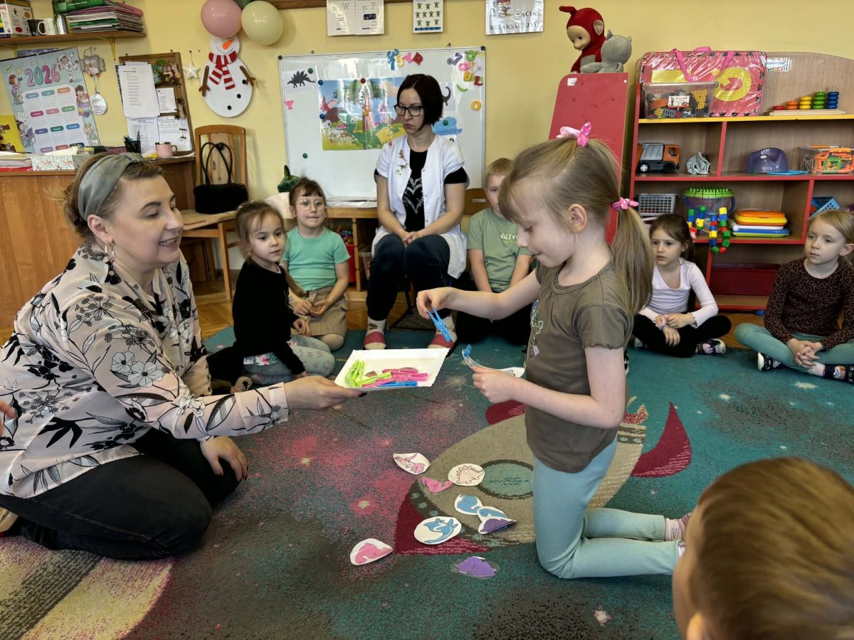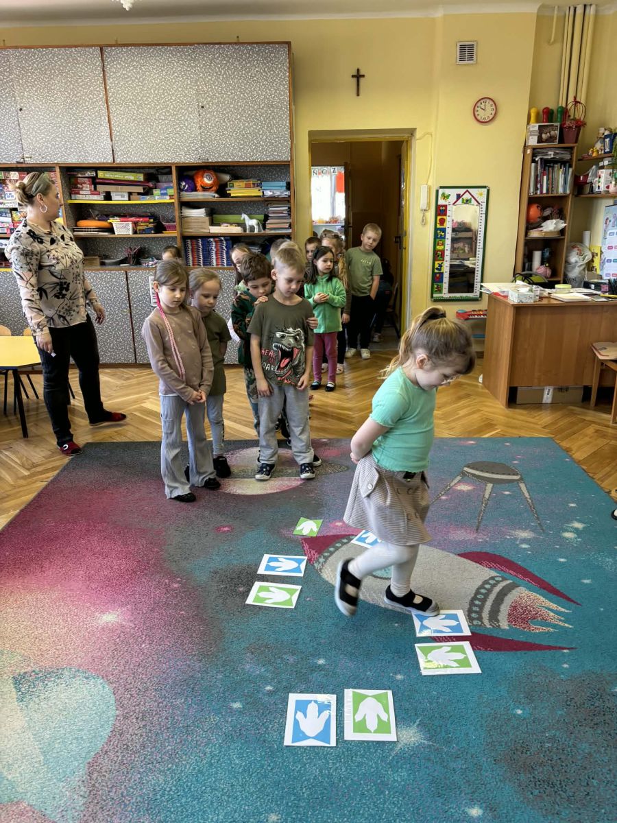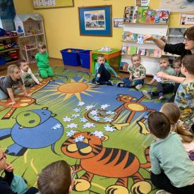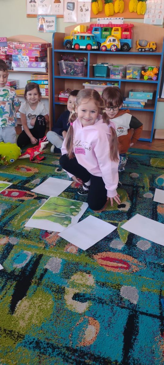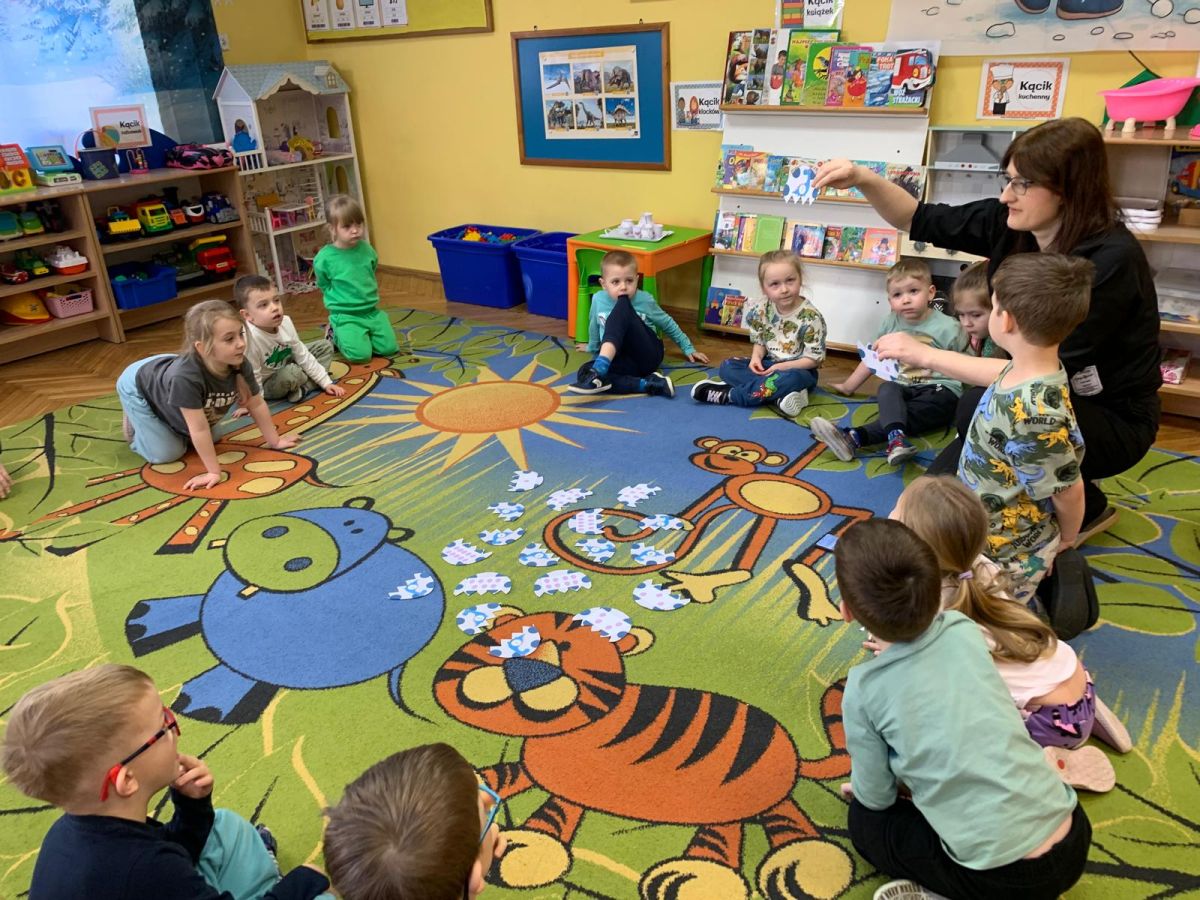 Najstarsze przedszkolaki rozpoczęły dzień od poznania wiersza „Dinozaury” autorstwa Agaty Dziechciarczyk oraz rozmowy o zawodzie paleontologa. Dowiedziały się, na czym polega praca badaczy odkrywających ślady przeszłości. Podczas zabaw muzyczno-ruchowych („Dinozaur się budzi”, „Dinozaurze kroki”, „Uciekamy przed wulkanem”, „Dino-stopy”) doskonaliły poczucie rytmu, refleks i koordynację ruchową. Wspólne układanie puzzli na wyścigi sprzyjało współpracy, a ćwiczenia gimnastyczne inspirowane ruchem dinozaurów rozwijały sprawność fizyczną. Dzieci uczestniczyły również w pracach wykopaliskowych, zabawach matematycznych (liczenie, porównywanie, segregowanie) oraz wykonały twórczą pracę plastyczną „Narodziny dinozaura”.