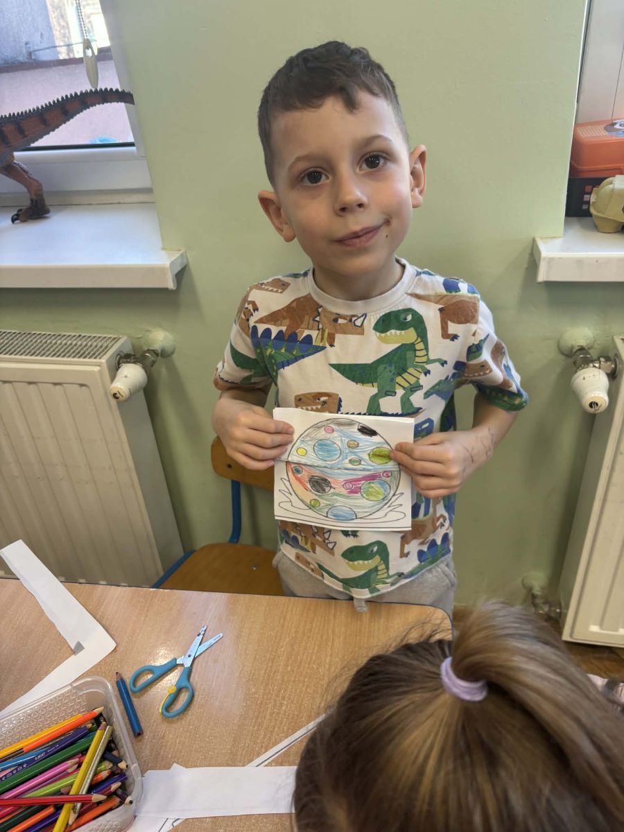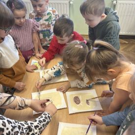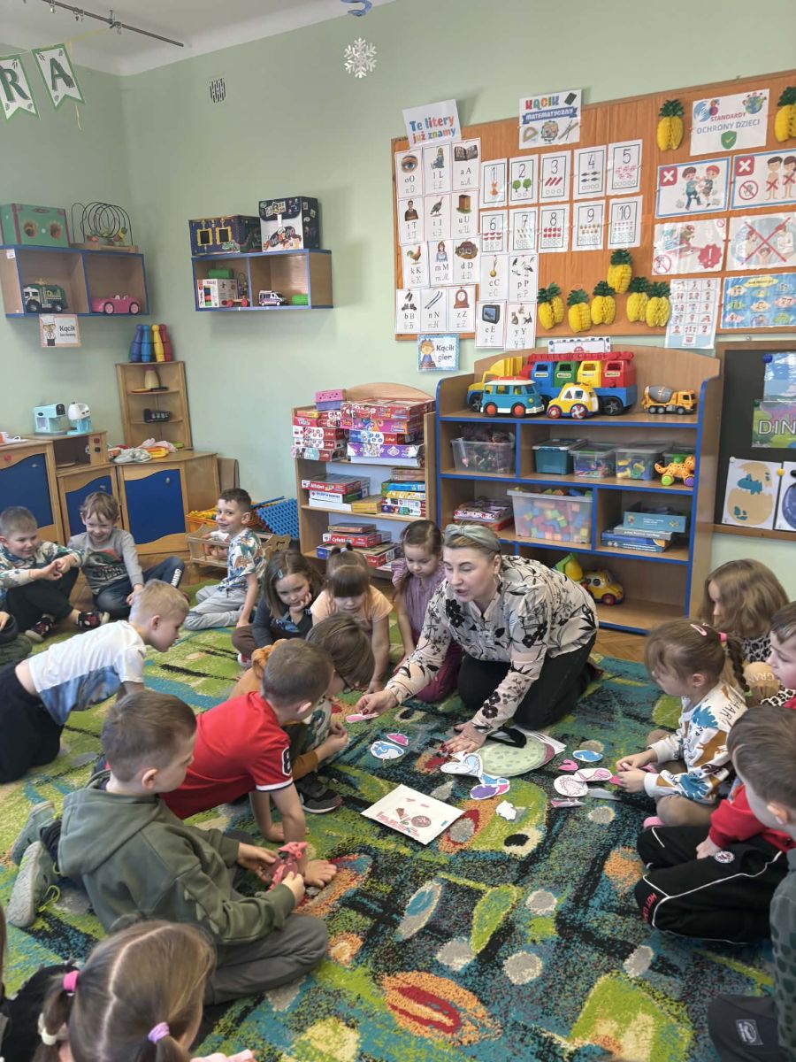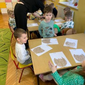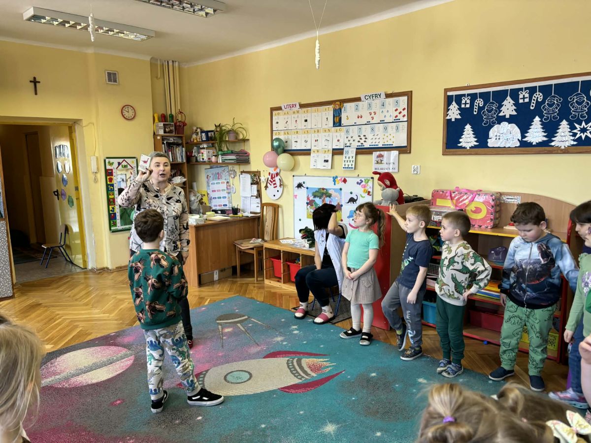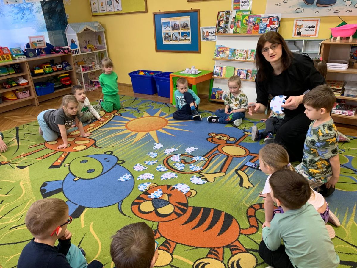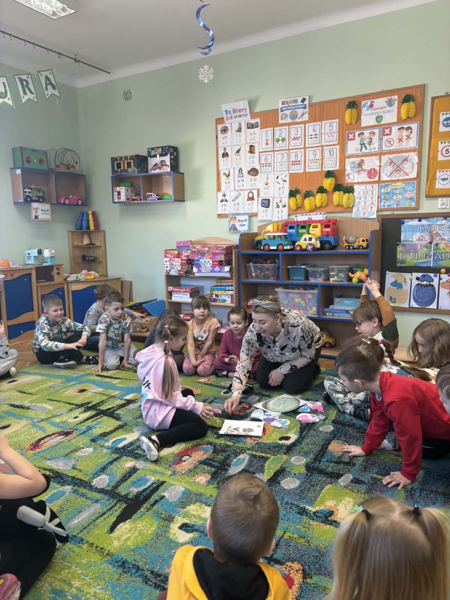 Najstarsze przedszkolaki rozpoczęły dzień od poznania wiersza „Dinozaury” autorstwa Agaty Dziechciarczyk oraz rozmowy o zawodzie paleontologa. Dowiedziały się, na czym polega praca badaczy odkrywających ślady przeszłości. Podczas zabaw muzyczno-ruchowych („Dinozaur się budzi”, „Dinozaurze kroki”, „Uciekamy przed wulkanem”, „Dino-stopy”) doskonaliły poczucie rytmu, refleks i koordynację ruchową. Wspólne układanie puzzli na wyścigi sprzyjało współpracy, a ćwiczenia gimnastyczne inspirowane ruchem dinozaurów rozwijały sprawność fizyczną. Dzieci uczestniczyły również w pracach wykopaliskowych, zabawach matematycznych (liczenie, porównywanie, segregowanie) oraz wykonały twórczą pracę plastyczną „Narodziny dinozaura”.