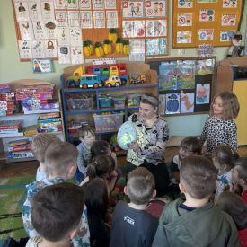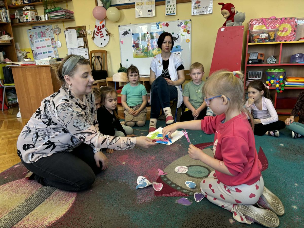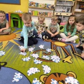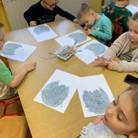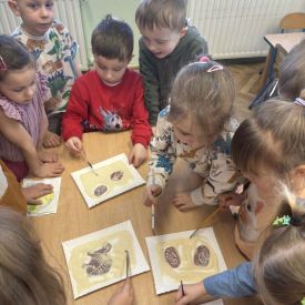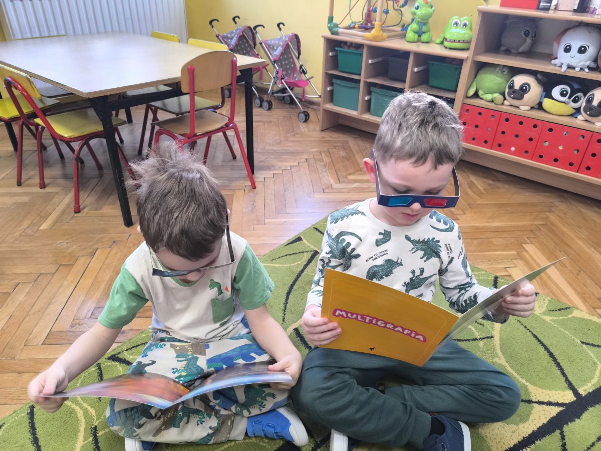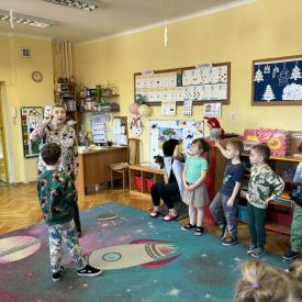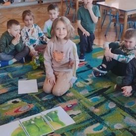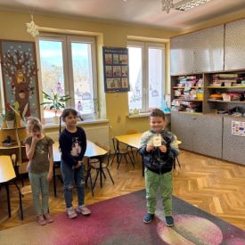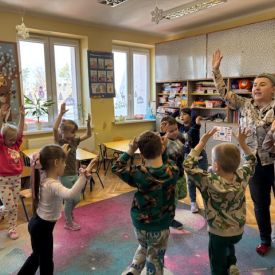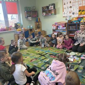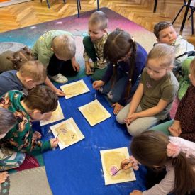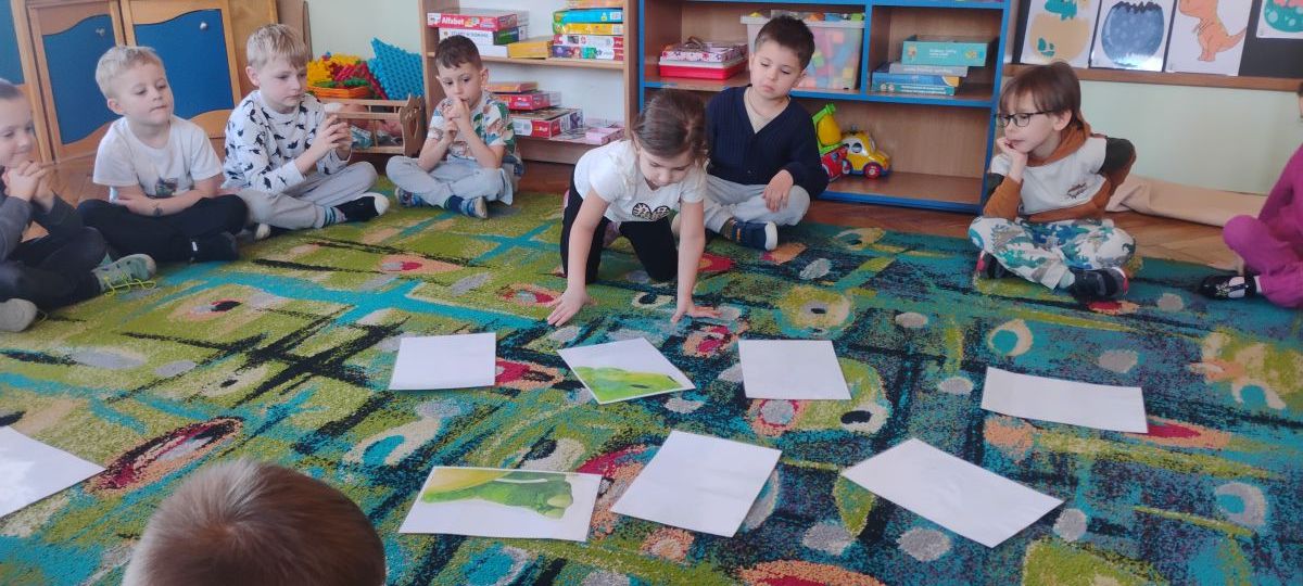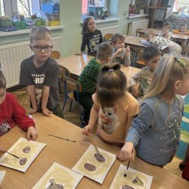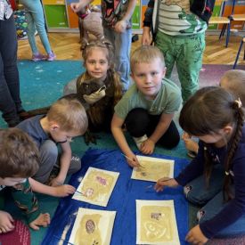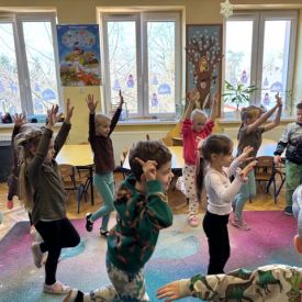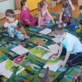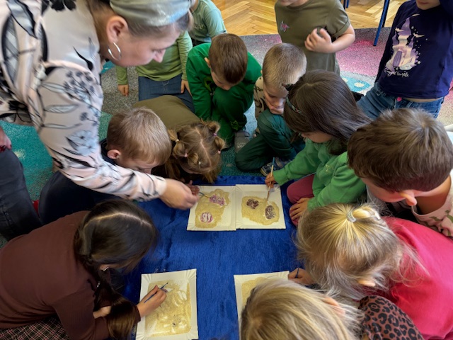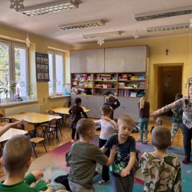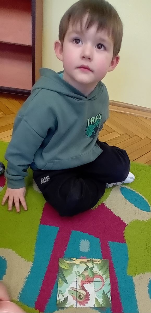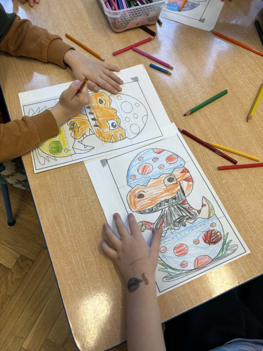 Najstarsze przedszkolaki rozpoczęły dzień od poznania wiersza „Dinozaury” autorstwa Agaty Dziechciarczyk oraz rozmowy o zawodzie paleontologa. Dowiedziały się, na czym polega praca badaczy odkrywających ślady przeszłości. Podczas zabaw muzyczno-ruchowych („Dinozaur się budzi”, „Dinozaurze kroki”, „Uciekamy przed wulkanem”, „Dino-stopy”) doskonaliły poczucie rytmu, refleks i koordynację ruchową. Wspólne układanie puzzli na wyścigi sprzyjało współpracy, a ćwiczenia gimnastyczne inspirowane ruchem dinozaurów rozwijały sprawność fizyczną. Dzieci uczestniczyły również w pracach wykopaliskowych, zabawach matematycznych (liczenie, porównywanie, segregowanie) oraz wykonały twórczą pracę plastyczną „Narodziny dinozaura”.