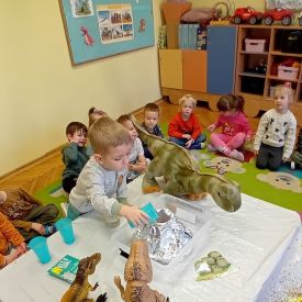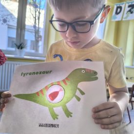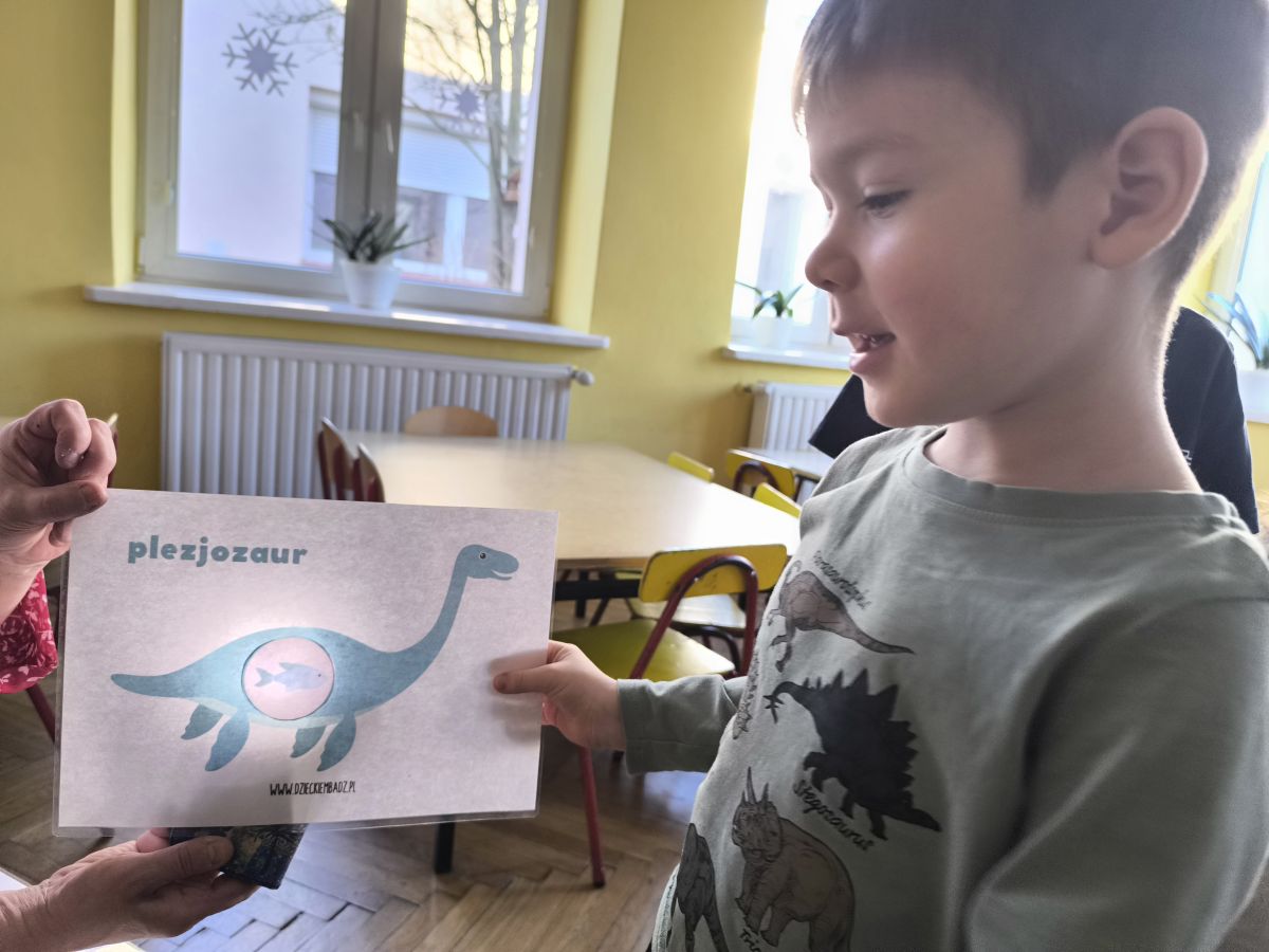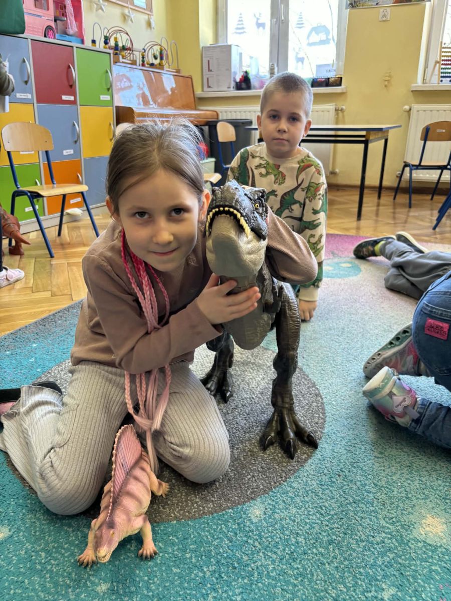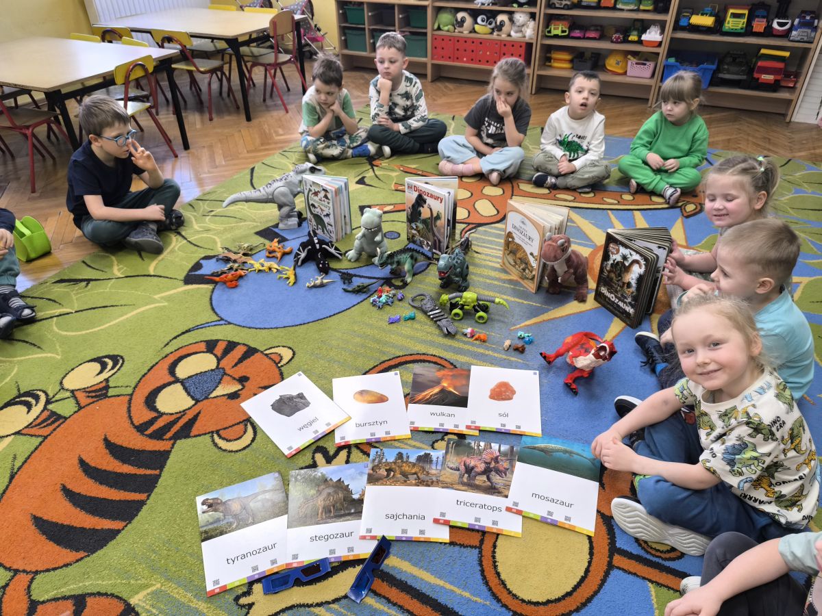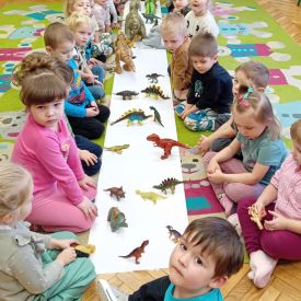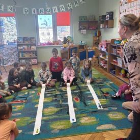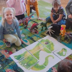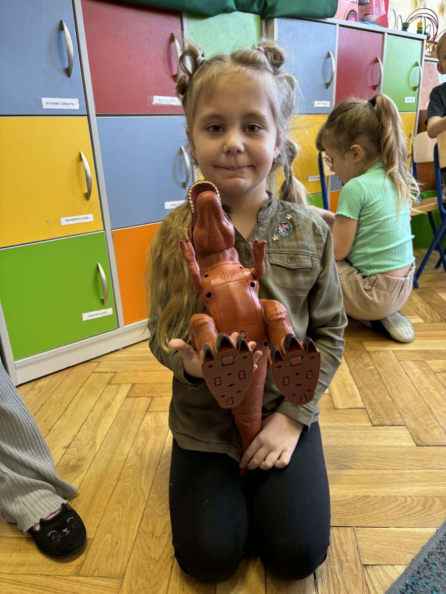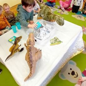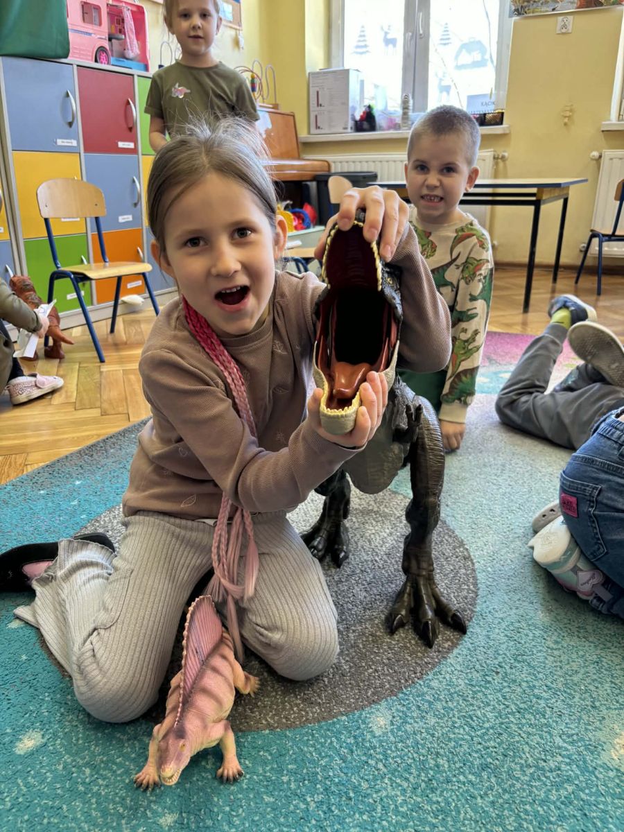 Starszaki zamieniły się w prawdziwych badaczy przeszłości. Podczas „wykopalisk” odnajdywały szkielet dinozaura, a z bryły lodu wydobywały „zamrożonego” prehistorycznego gada, poznając właściwości wody i lodu. Z pomocą latarki sprawdzały, jaki dinozaur ukrył się w jajku oraz analizowały jego pożywienie. Kodowanie na macie rozwijało logiczne myślenie i orientację przestrzenną, a dopasowywanie obrazka do opisu – uważne słuchanie i analizę treści. Nie zabrakło zabaw matematycznych – przeliczania, porównywania liczebności zbiorów oraz „Wyścigów dinozaurów”, które ćwiczyły precyzję i tempo działania. Dzieci poznały również wiele ciekawostek o życiu dinozaurów, łącząc zabawę z wiedzą.