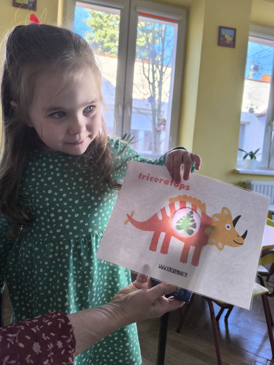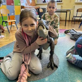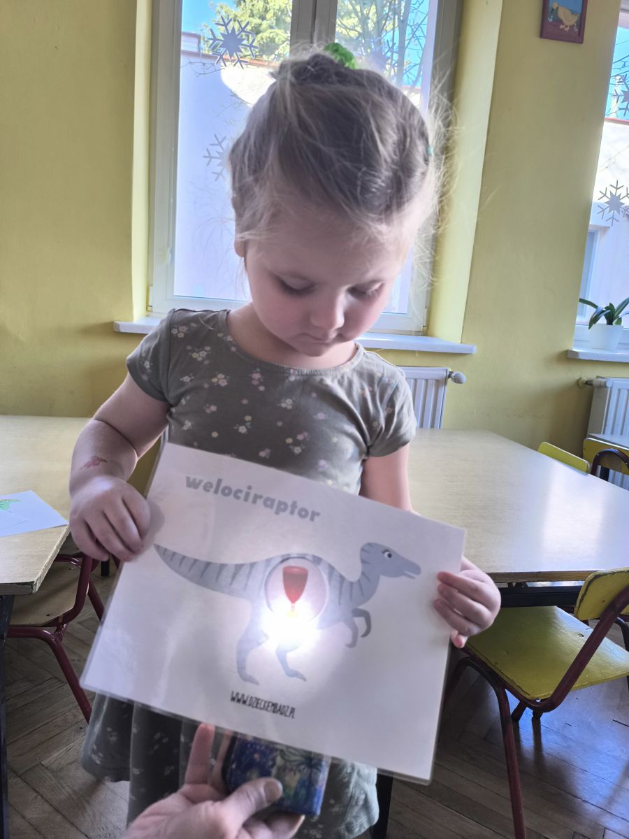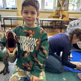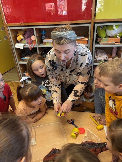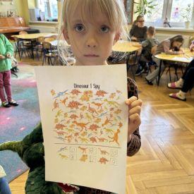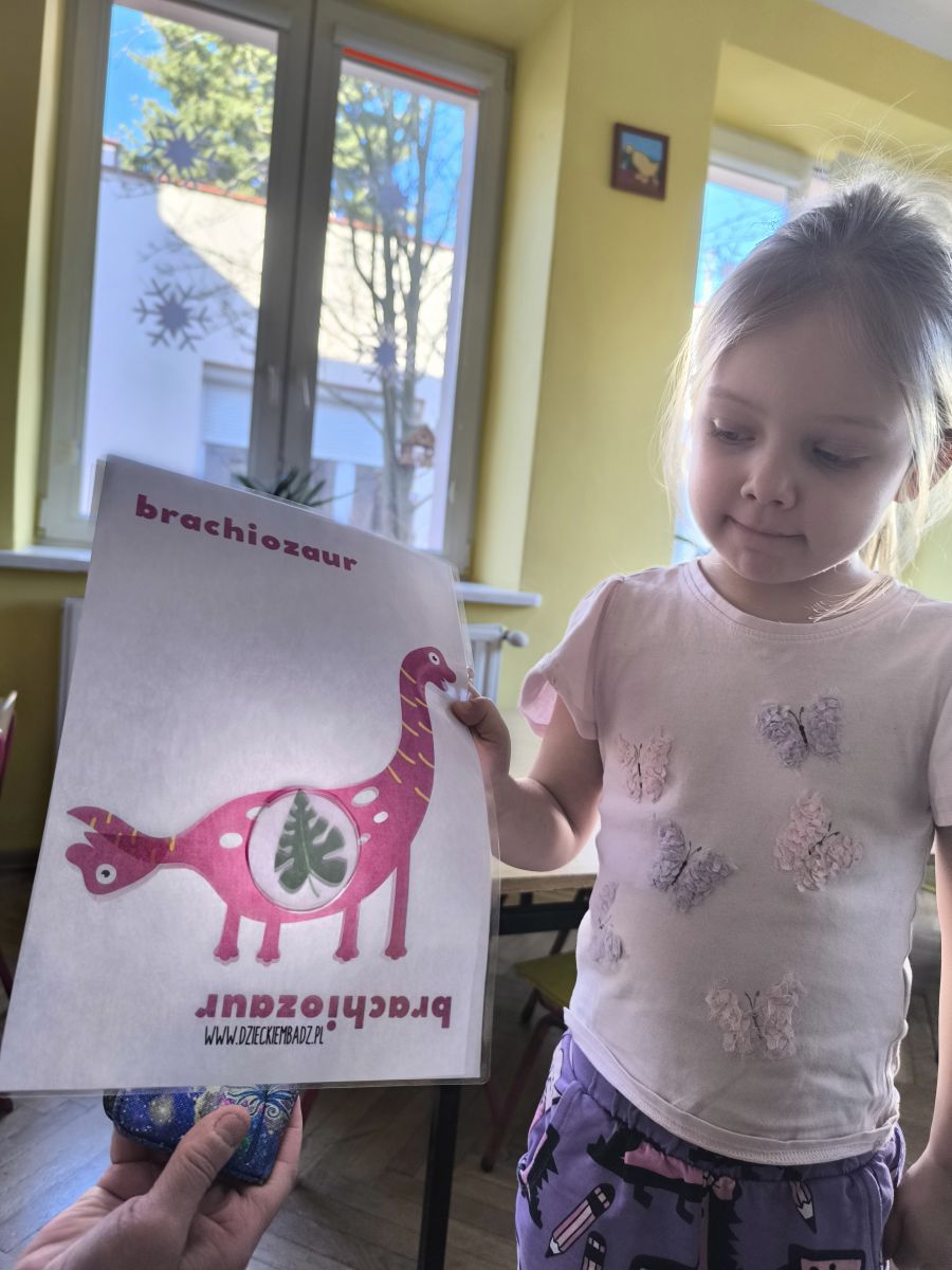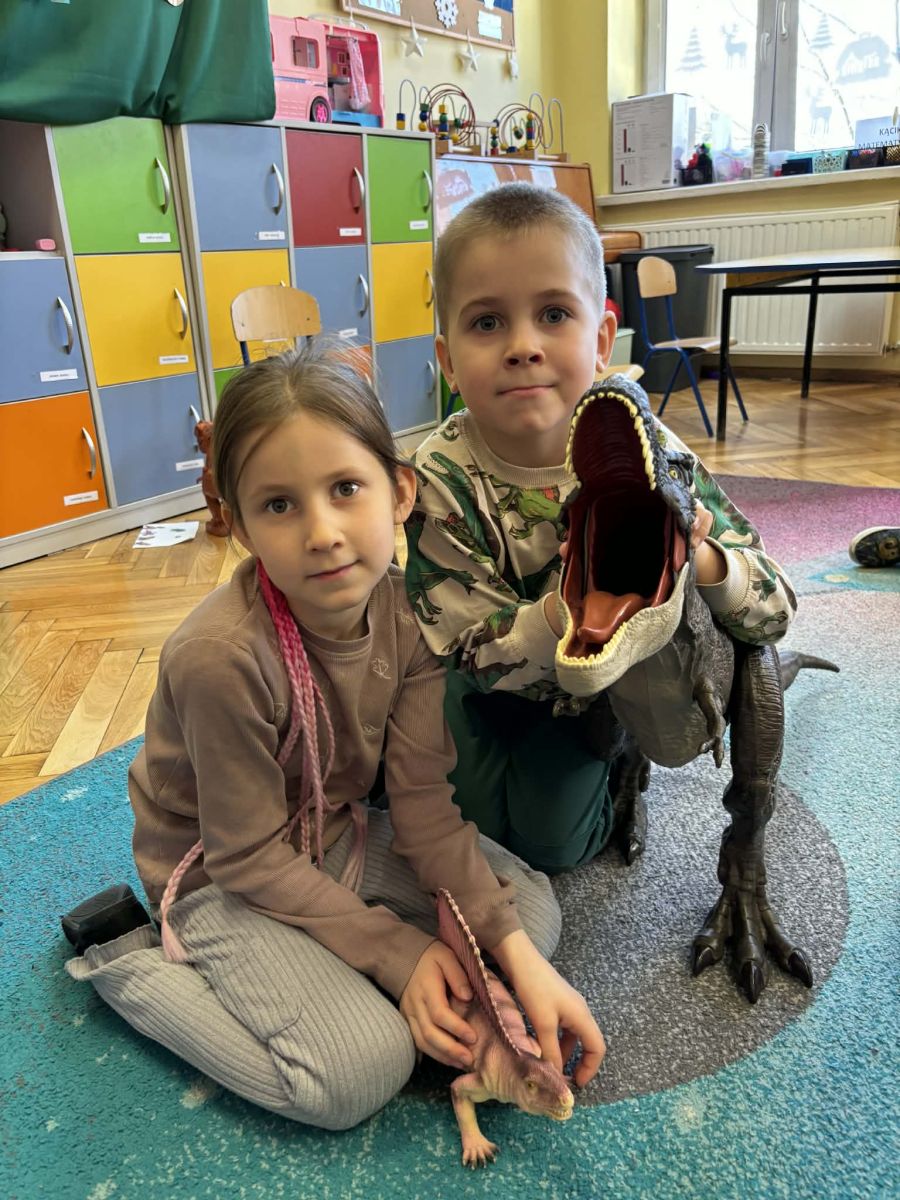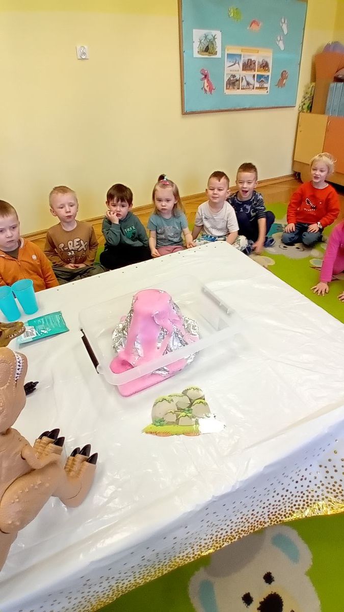 Starszaki zamieniły się w prawdziwych badaczy przeszłości. Podczas „wykopalisk” odnajdywały szkielet dinozaura, a z bryły lodu wydobywały „zamrożonego” prehistorycznego gada, poznając właściwości wody i lodu. Z pomocą latarki sprawdzały, jaki dinozaur ukrył się w jajku oraz analizowały jego pożywienie. Kodowanie na macie rozwijało logiczne myślenie i orientację przestrzenną, a dopasowywanie obrazka do opisu – uważne słuchanie i analizę treści. Nie zabrakło zabaw matematycznych – przeliczania, porównywania liczebności zbiorów oraz „Wyścigów dinozaurów”, które ćwiczyły precyzję i tempo działania. Dzieci poznały również wiele ciekawostek o życiu dinozaurów, łącząc zabawę z wiedzą.