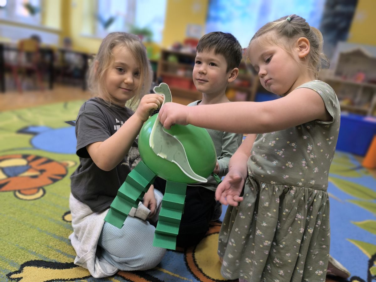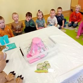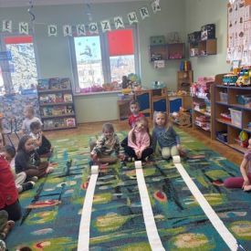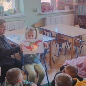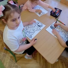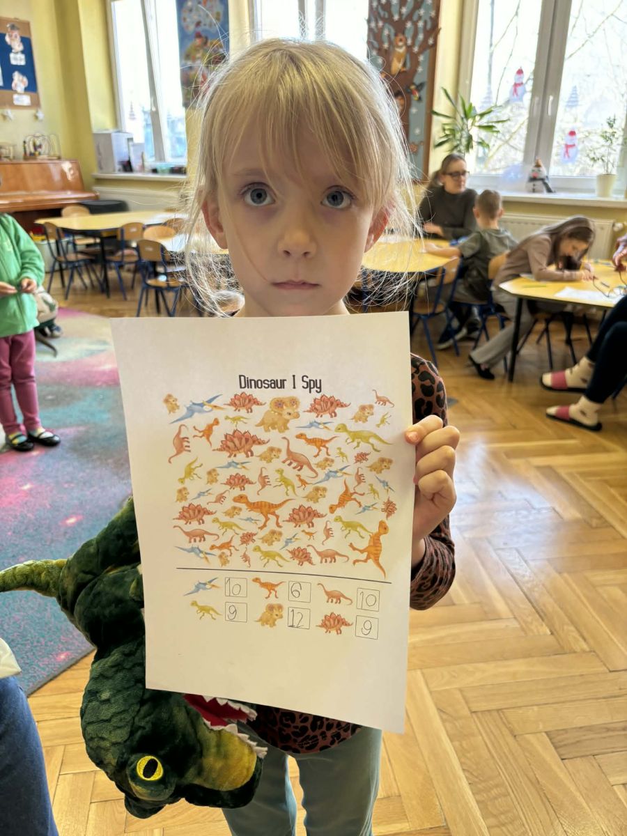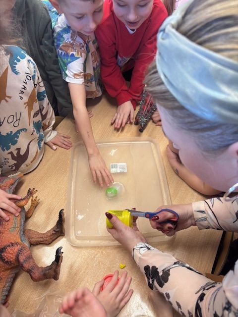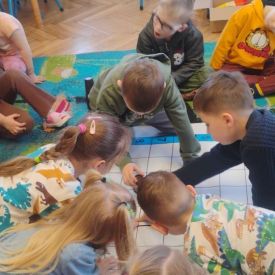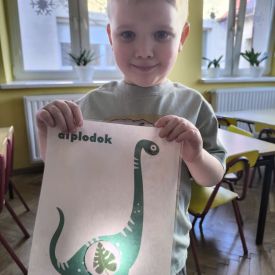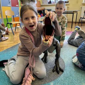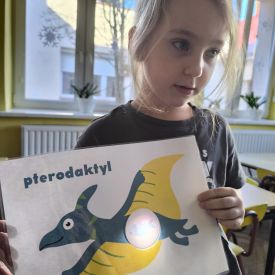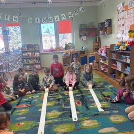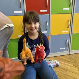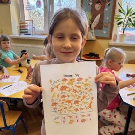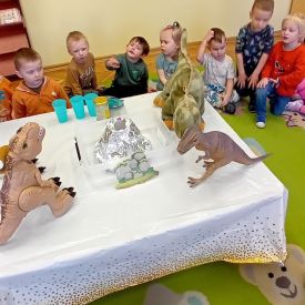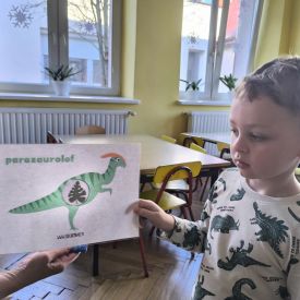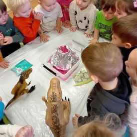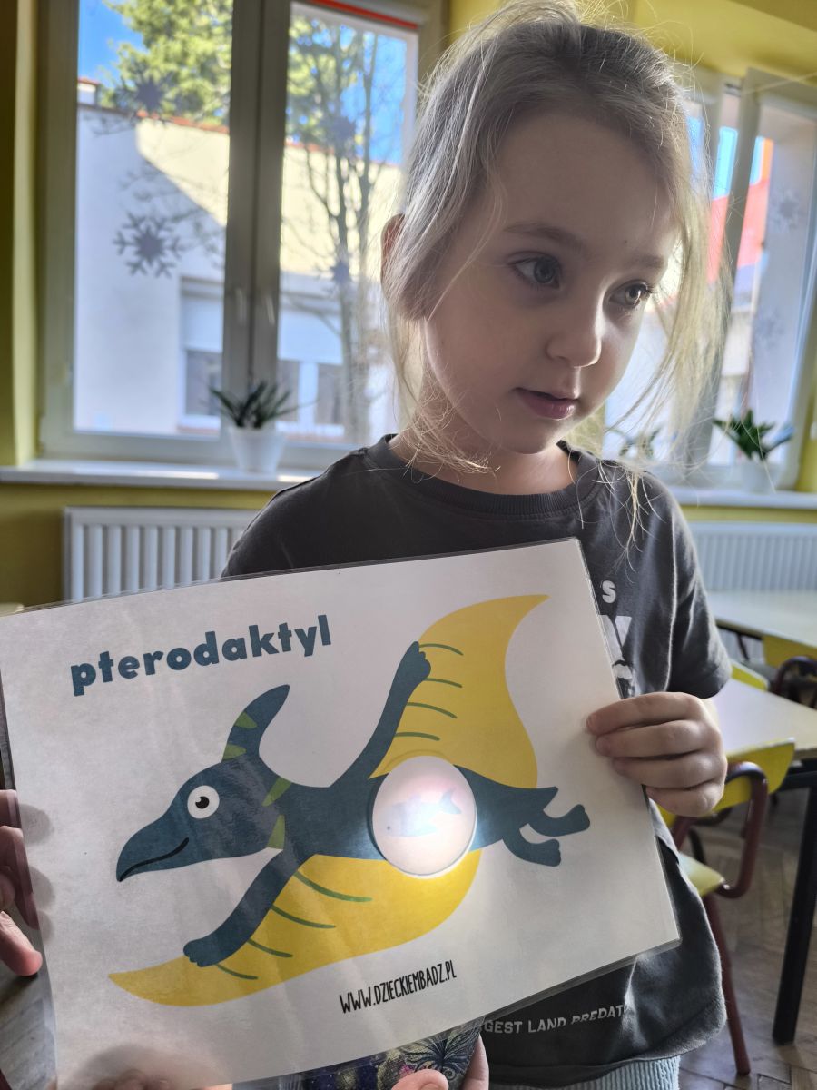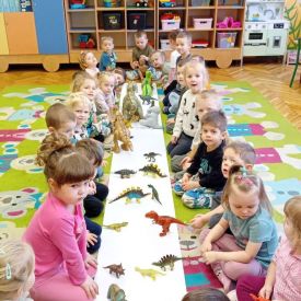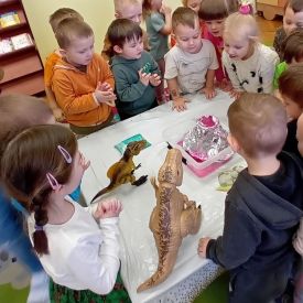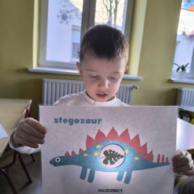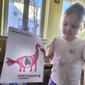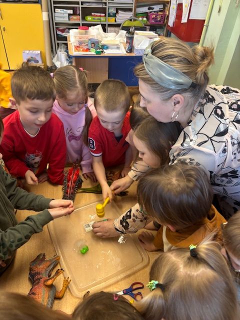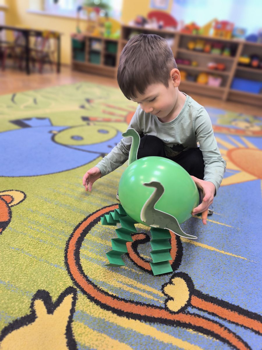 Starszaki zamieniły się w prawdziwych badaczy przeszłości. Podczas „wykopalisk” odnajdywały szkielet dinozaura, a z bryły lodu wydobywały „zamrożonego” prehistorycznego gada, poznając właściwości wody i lodu. Z pomocą latarki sprawdzały, jaki dinozaur ukrył się w jajku oraz analizowały jego pożywienie. Kodowanie na macie rozwijało logiczne myślenie i orientację przestrzenną, a dopasowywanie obrazka do opisu – uważne słuchanie i analizę treści. Nie zabrakło zabaw matematycznych – przeliczania, porównywania liczebności zbiorów oraz „Wyścigów dinozaurów”, które ćwiczyły precyzję i tempo działania. Dzieci poznały również wiele ciekawostek o życiu dinozaurów, łącząc zabawę z wiedzą.
