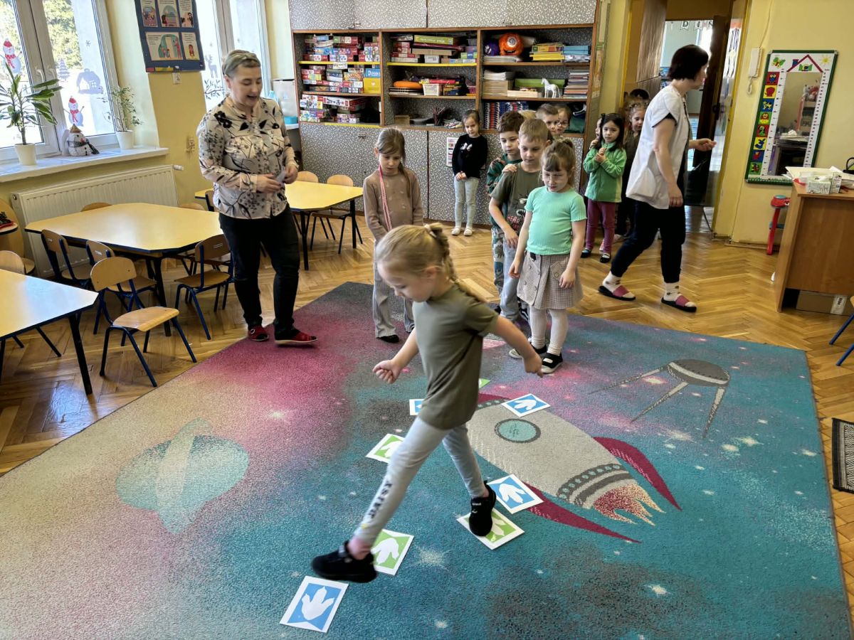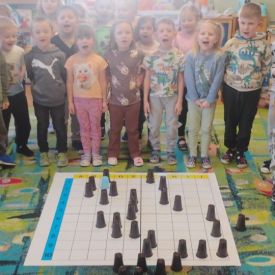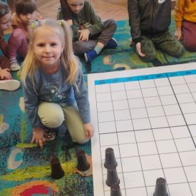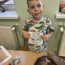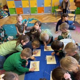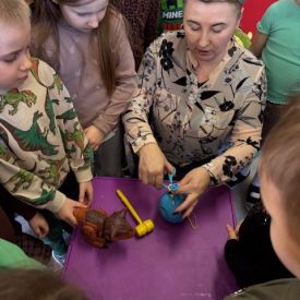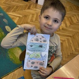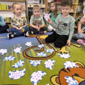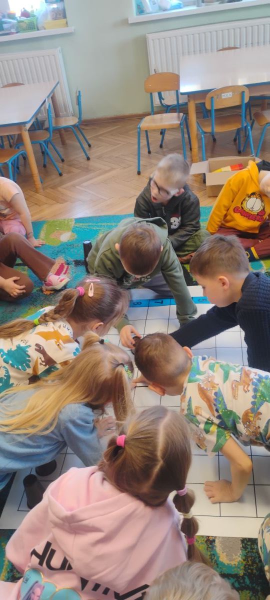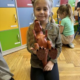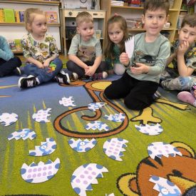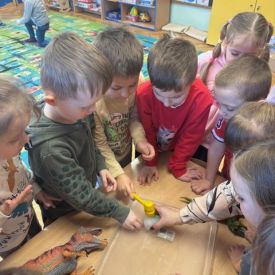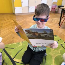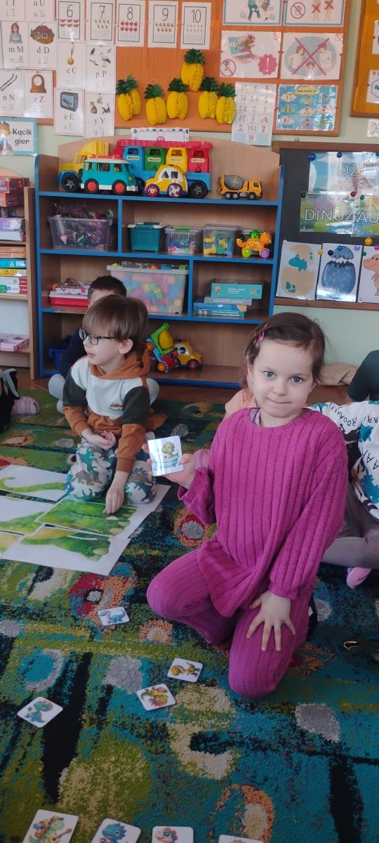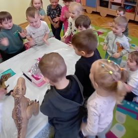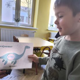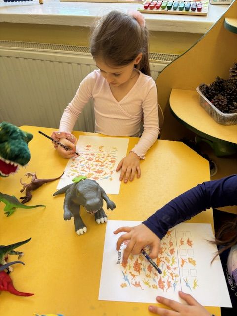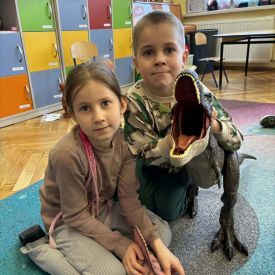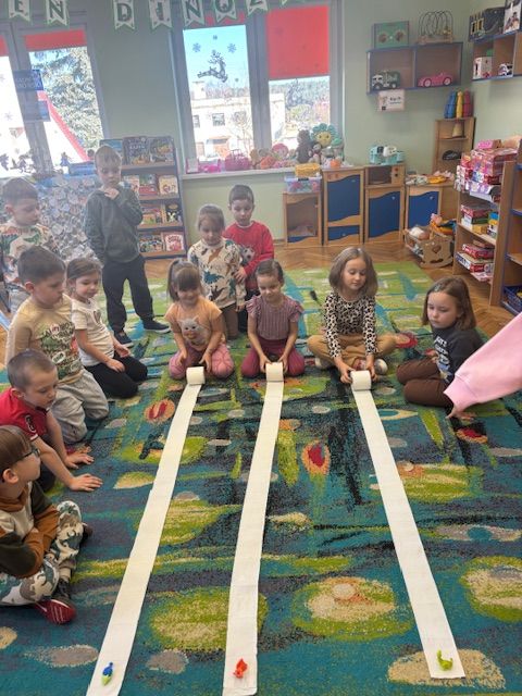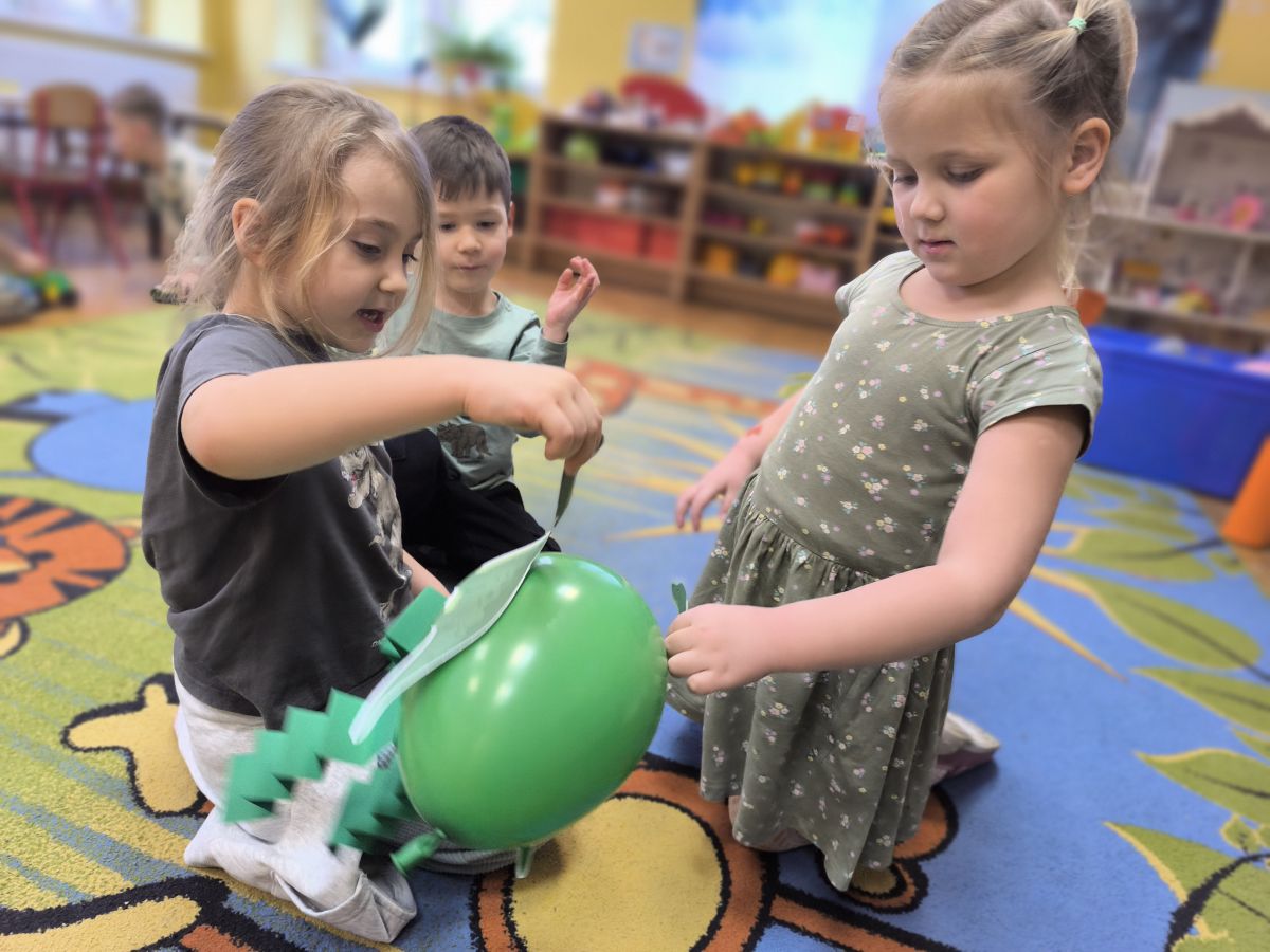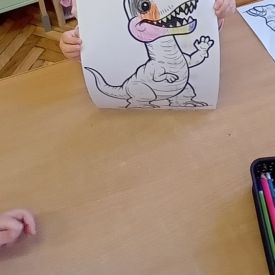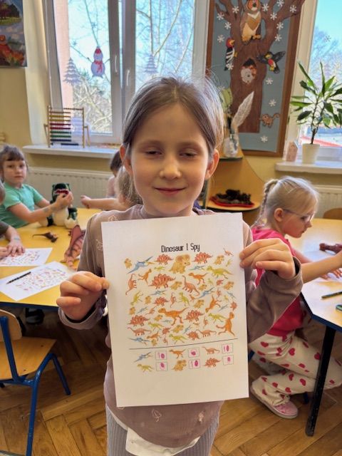 Starszaki zamieniły się w prawdziwych badaczy przeszłości. Podczas „wykopalisk” odnajdywały szkielet dinozaura, a z bryły lodu wydobywały „zamrożonego” prehistorycznego gada, poznając właściwości wody i lodu. Z pomocą latarki sprawdzały, jaki dinozaur ukrył się w jajku oraz analizowały jego pożywienie. Kodowanie na macie rozwijało logiczne myślenie i orientację przestrzenną, a dopasowywanie obrazka do opisu – uważne słuchanie i analizę treści. Nie zabrakło zabaw matematycznych – przeliczania, porównywania liczebności zbiorów oraz „Wyścigów dinozaurów”, które ćwiczyły precyzję i tempo działania. Dzieci poznały również wiele ciekawostek o życiu dinozaurów, łącząc zabawę z wiedzą.