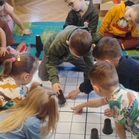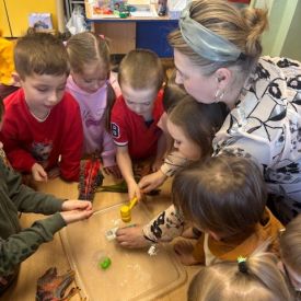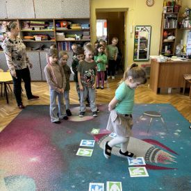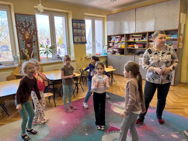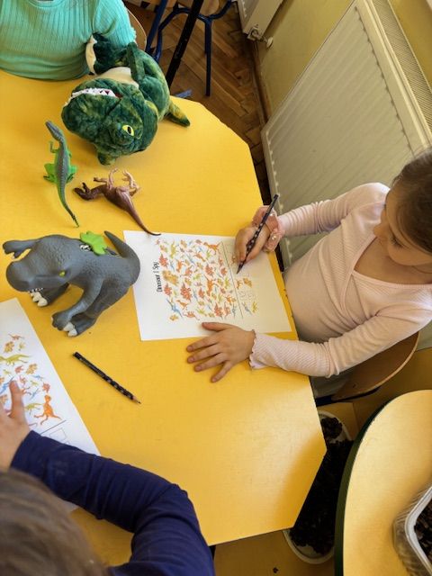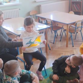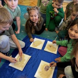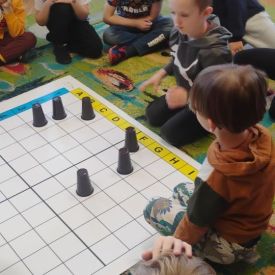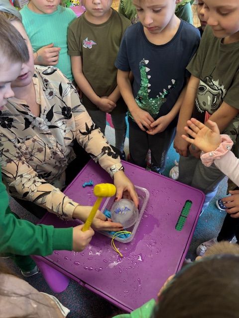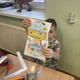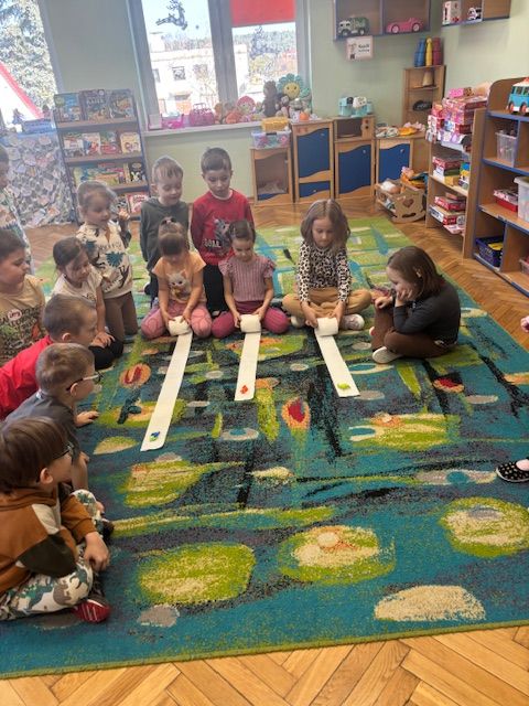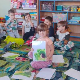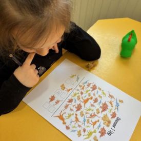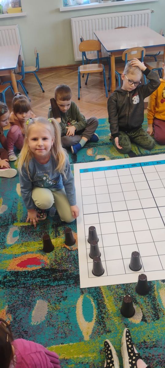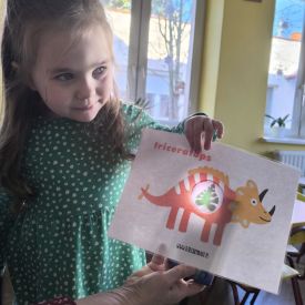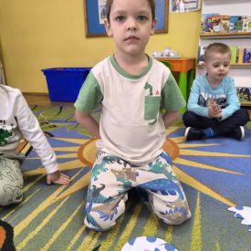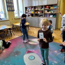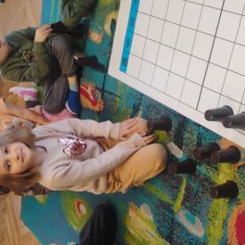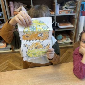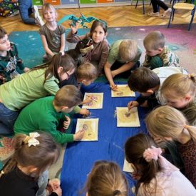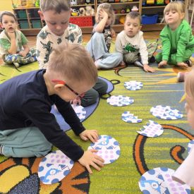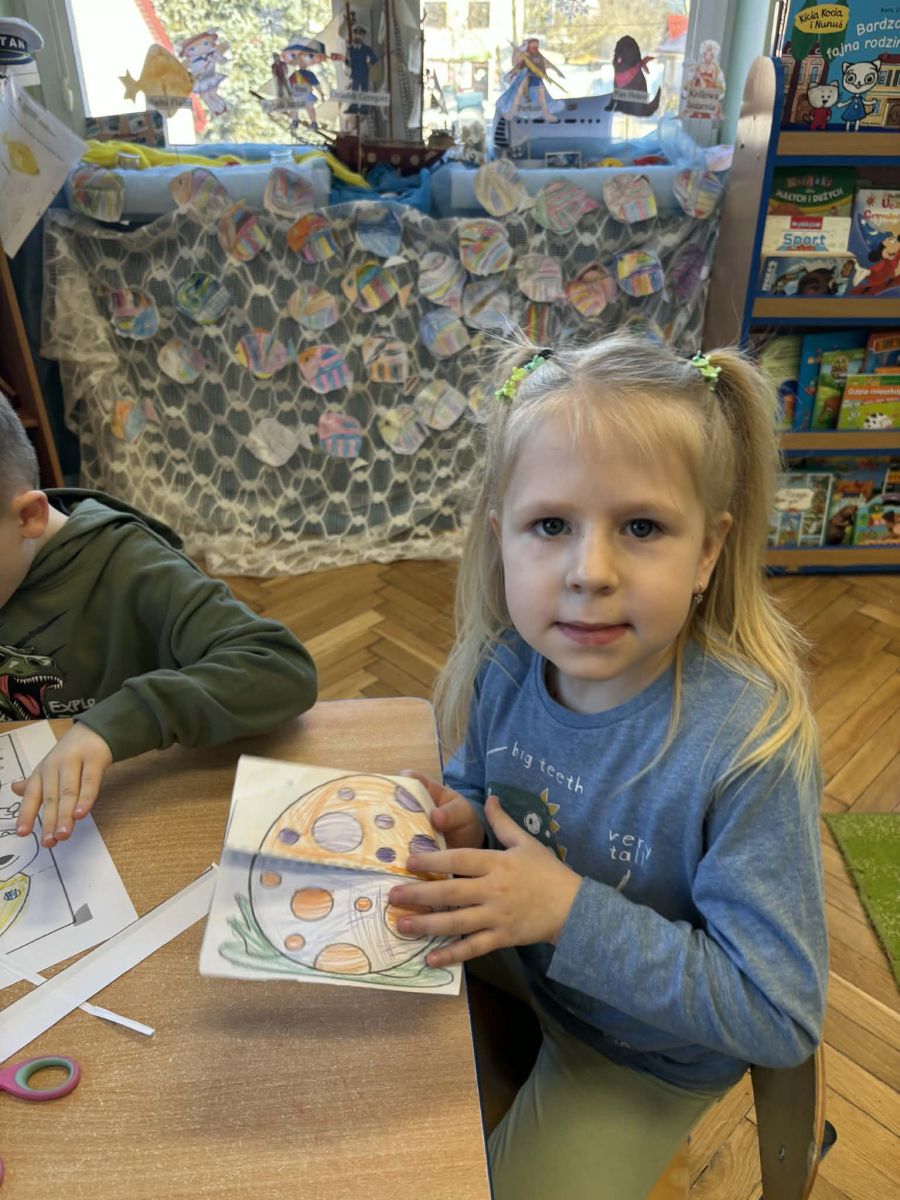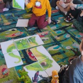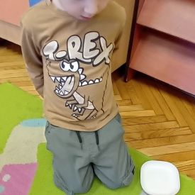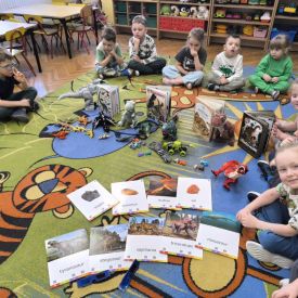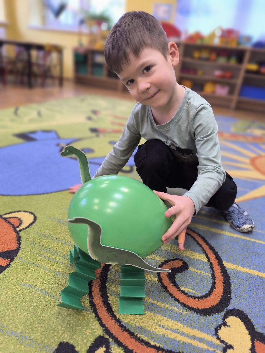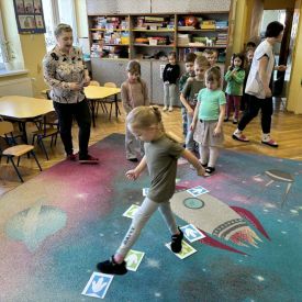 Starszaki zamieniły się w prawdziwych badaczy przeszłości. Podczas „wykopalisk” odnajdywały szkielet dinozaura, a z bryły lodu wydobywały „zamrożonego” prehistorycznego gada, poznając właściwości wody i lodu. Z pomocą latarki sprawdzały, jaki dinozaur ukrył się w jajku oraz analizowały jego pożywienie. Kodowanie na macie rozwijało logiczne myślenie i orientację przestrzenną, a dopasowywanie obrazka do opisu – uważne słuchanie i analizę treści. Nie zabrakło zabaw matematycznych – przeliczania, porównywania liczebności zbiorów oraz „Wyścigów dinozaurów”, które ćwiczyły precyzję i tempo działania. Dzieci poznały również wiele ciekawostek o życiu dinozaurów, łącząc zabawę z wiedzą.