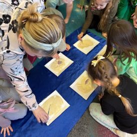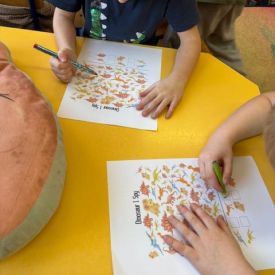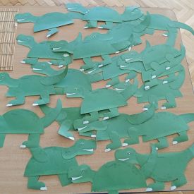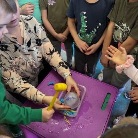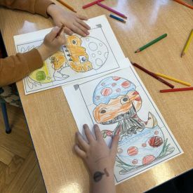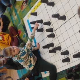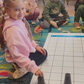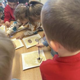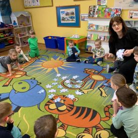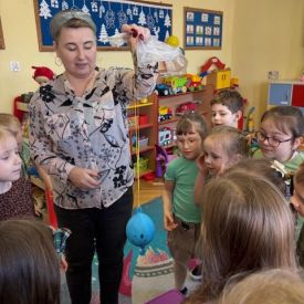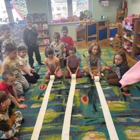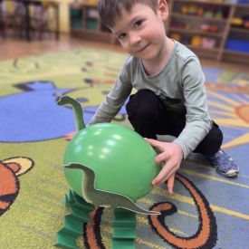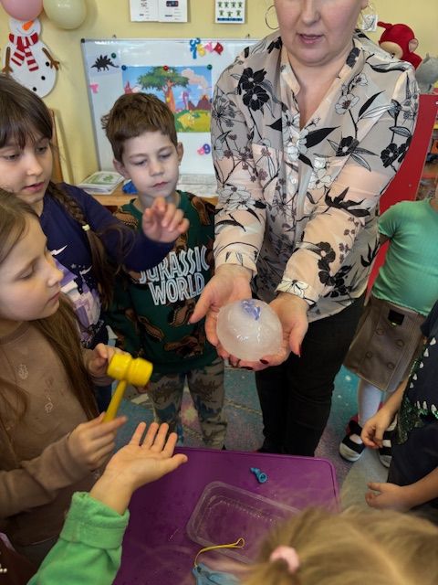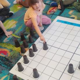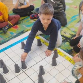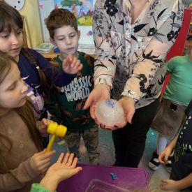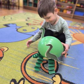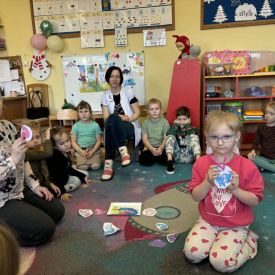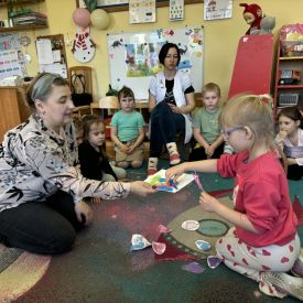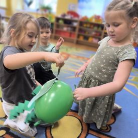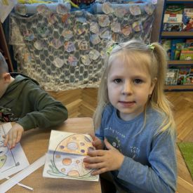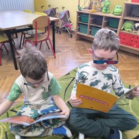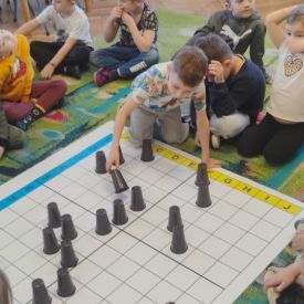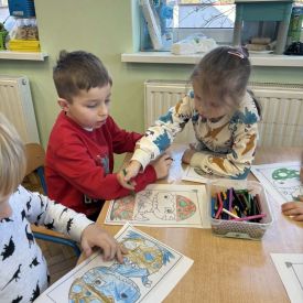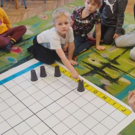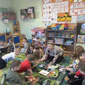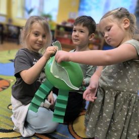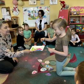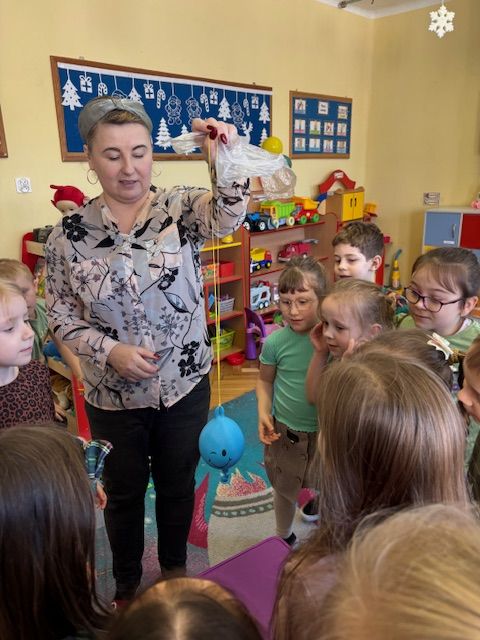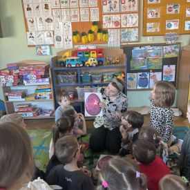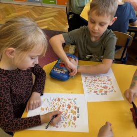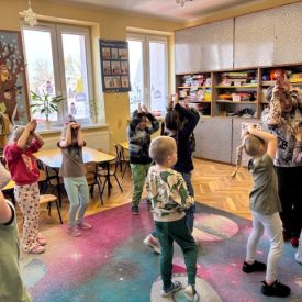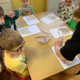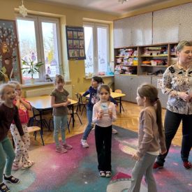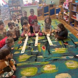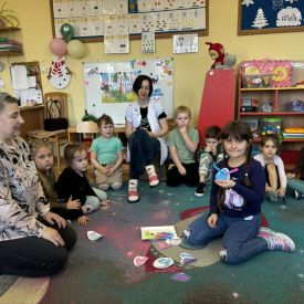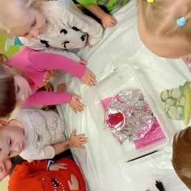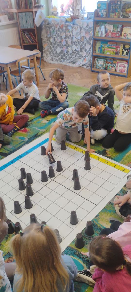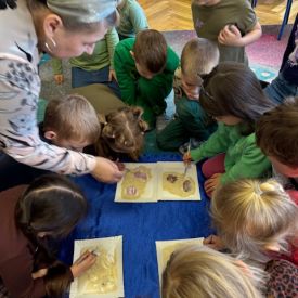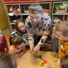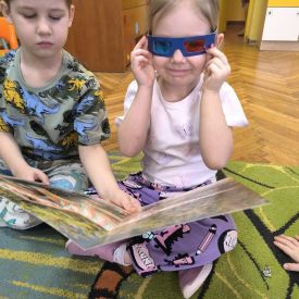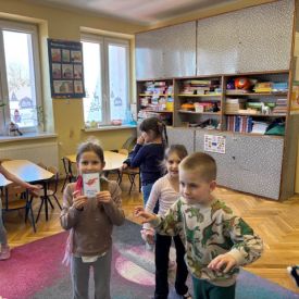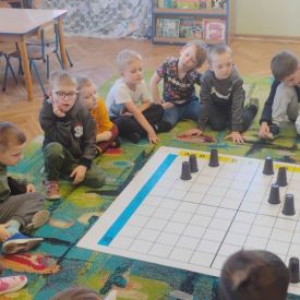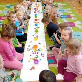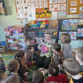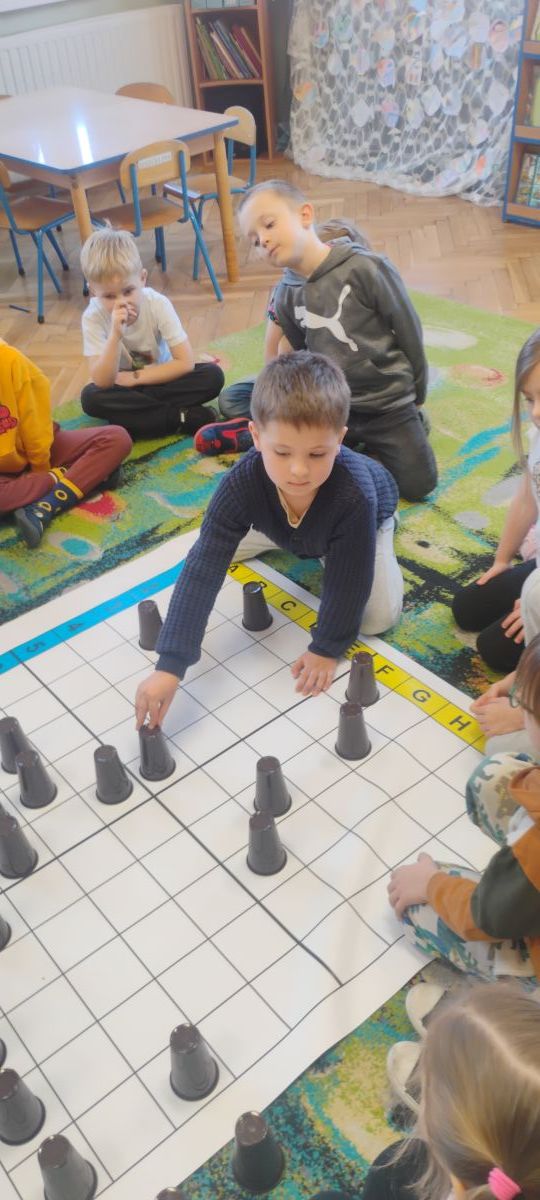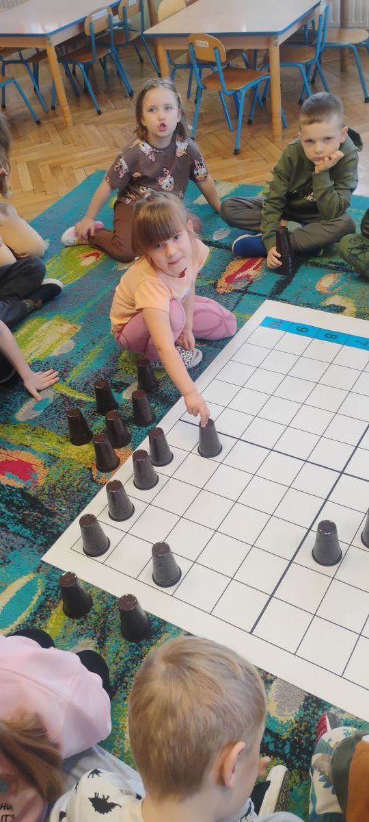 Starszaki zamieniły się w prawdziwych badaczy przeszłości. Podczas „wykopalisk” odnajdywały szkielet dinozaura, a z bryły lodu wydobywały „zamrożonego” prehistorycznego gada, poznając właściwości wody i lodu. Z pomocą latarki sprawdzały, jaki dinozaur ukrył się w jajku oraz analizowały jego pożywienie. Kodowanie na macie rozwijało logiczne myślenie i orientację przestrzenną, a dopasowywanie obrazka do opisu – uważne słuchanie i analizę treści. Nie zabrakło zabaw matematycznych – przeliczania, porównywania liczebności zbiorów oraz „Wyścigów dinozaurów”, które ćwiczyły precyzję i tempo działania. Dzieci poznały również wiele ciekawostek o życiu dinozaurów, łącząc zabawę z wiedzą.