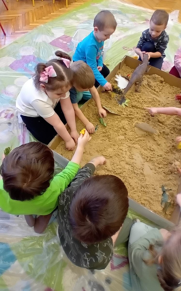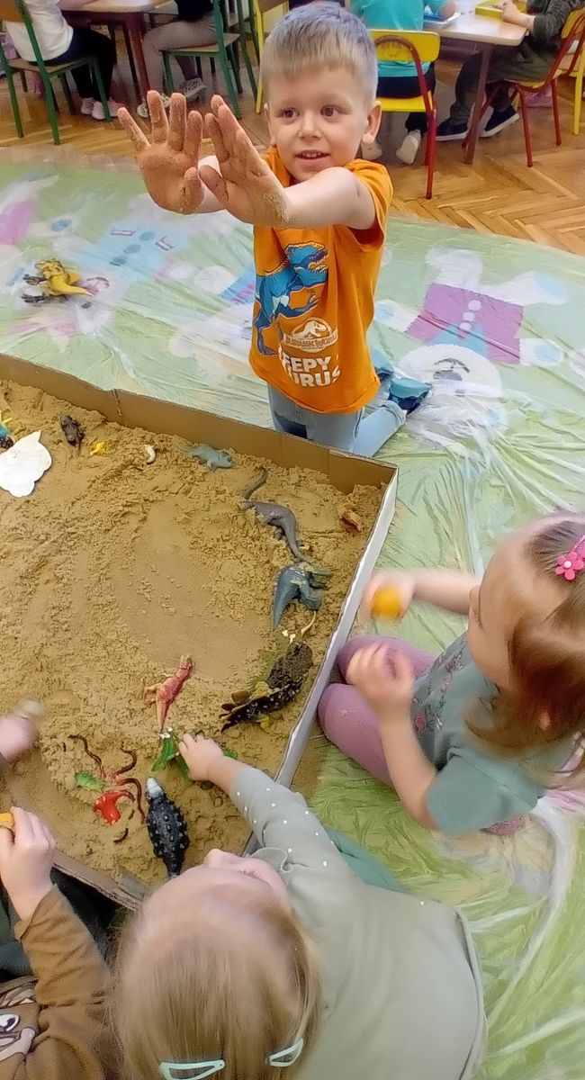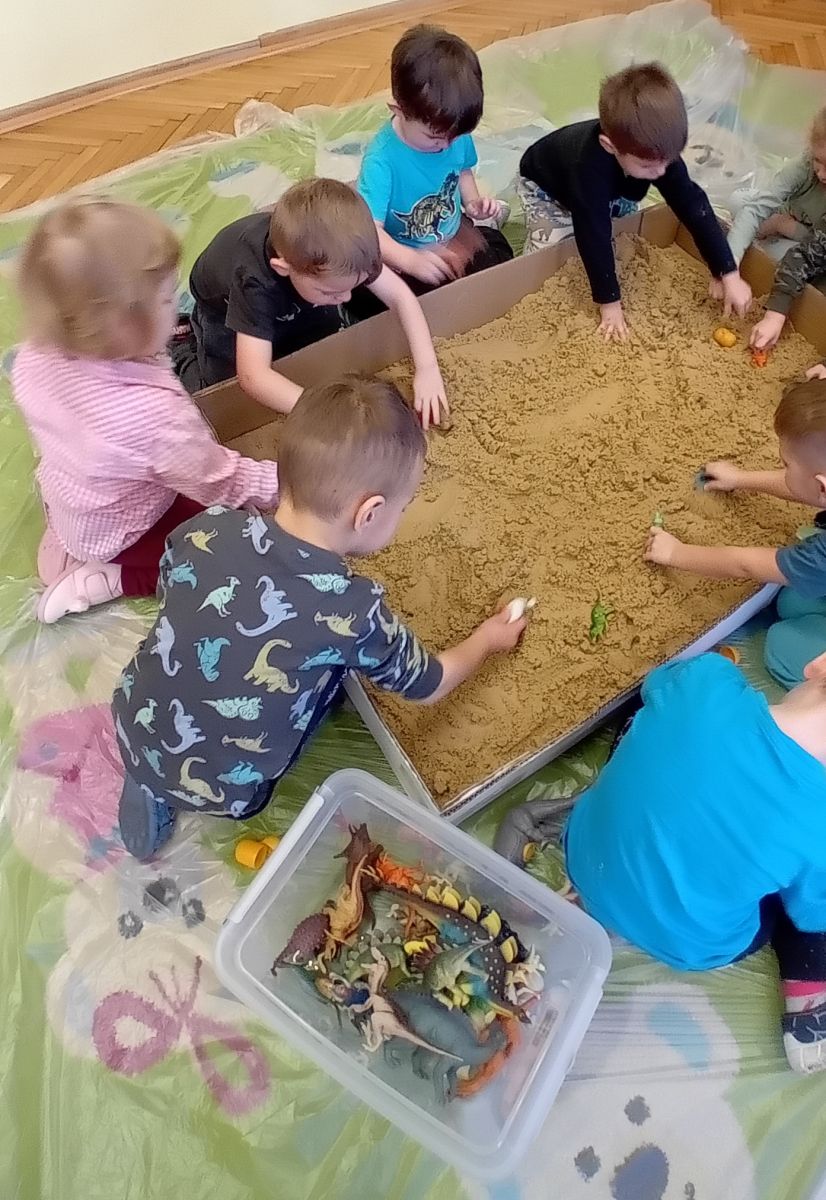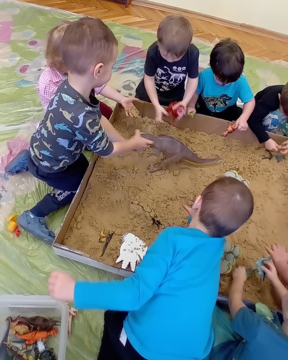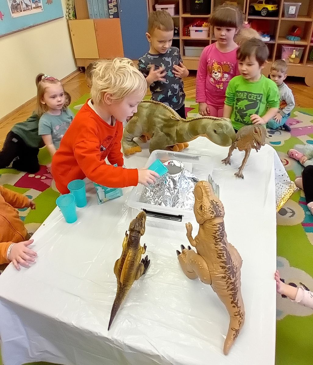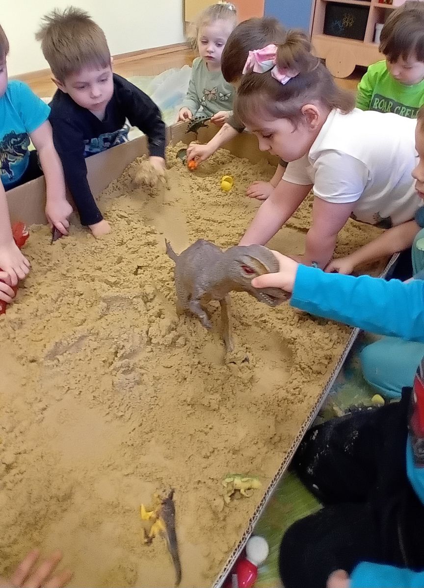 Najmłodsze dzieci poznawały dinozaury poprzez zabawy rozwijające spostrzegawczość i zmysły. Układały puzzle oraz grały w memory obrazkowe, ćwicząc pamięć i koncentrację. W zabawach sensorycznych z piaskiem kinetycznym i naturalnym wyszukiwały ukryte figurki dinozaurów, wcielając się w małych odkrywców. Duże wrażenie zrobiło doświadczenie „Wulkan”, które w prosty i atrakcyjny sposób przybliżyło dzieciom zjawiska przyrodnicze. Kolorowanie ilustracji oraz segregowanie figurek według kolorów pozwoliło utrwalić umiejętność klasyfikowania i rozwijać sprawność manualną.