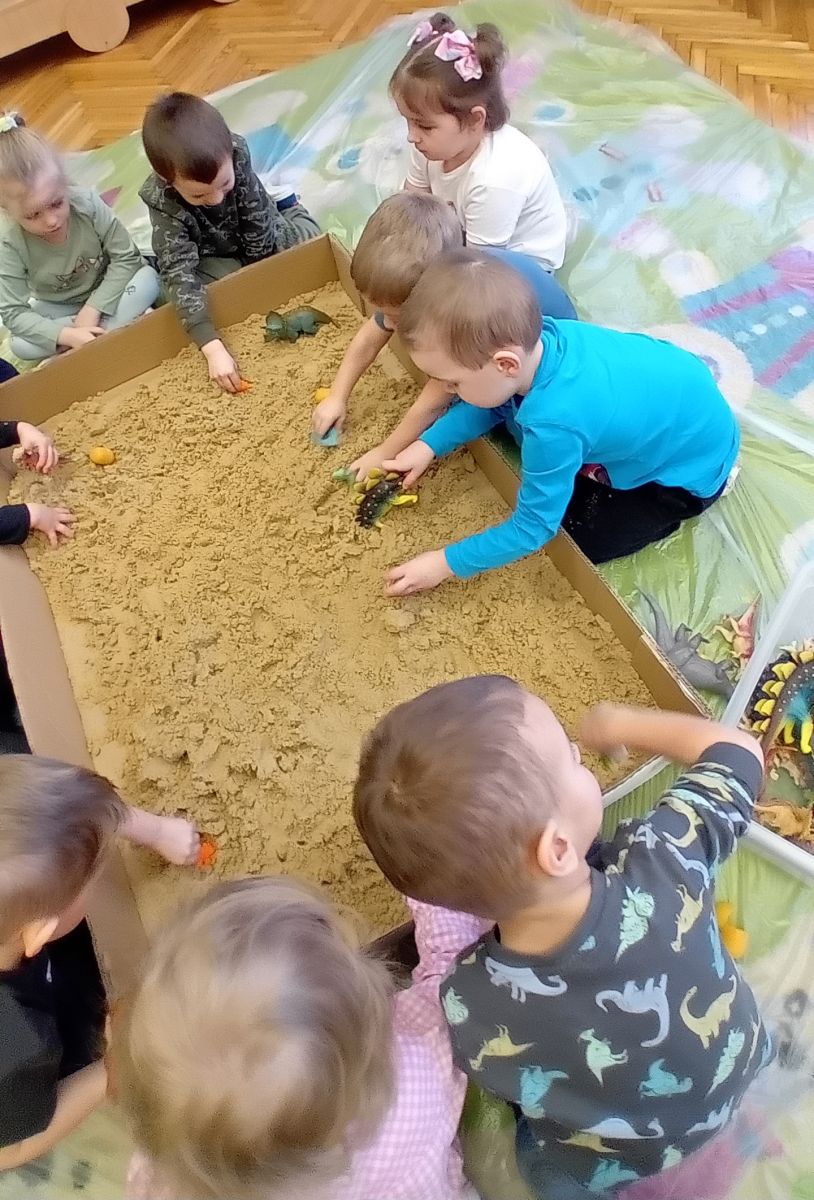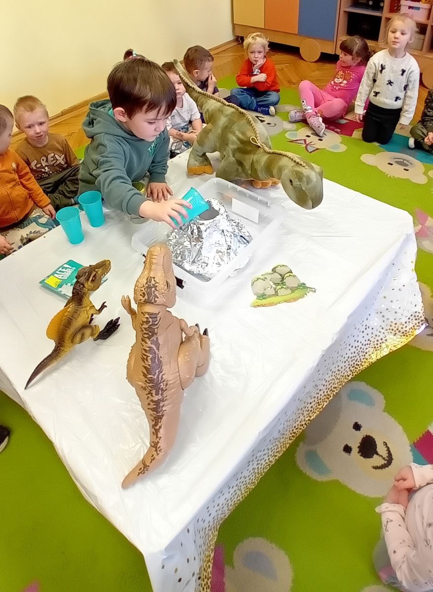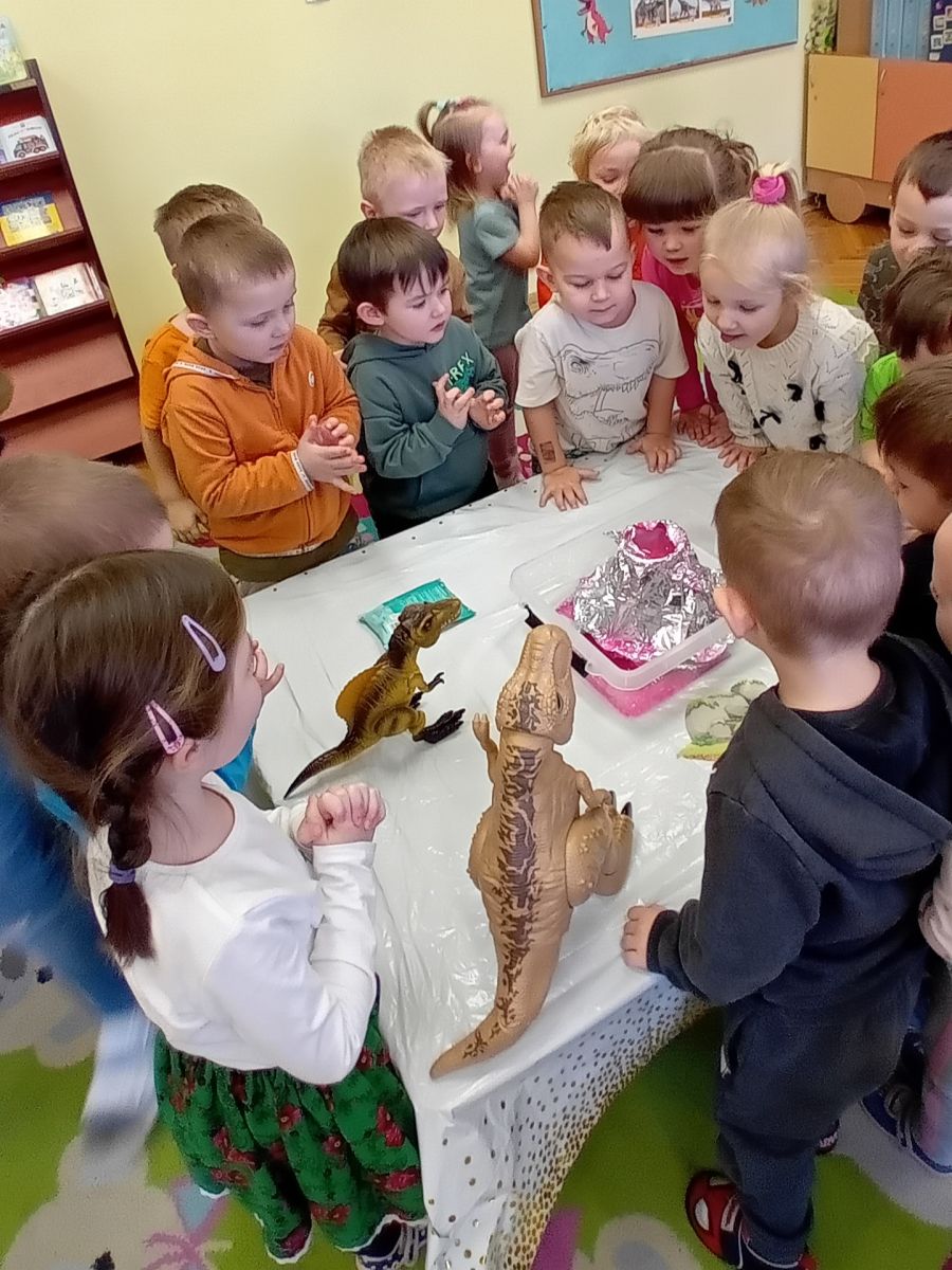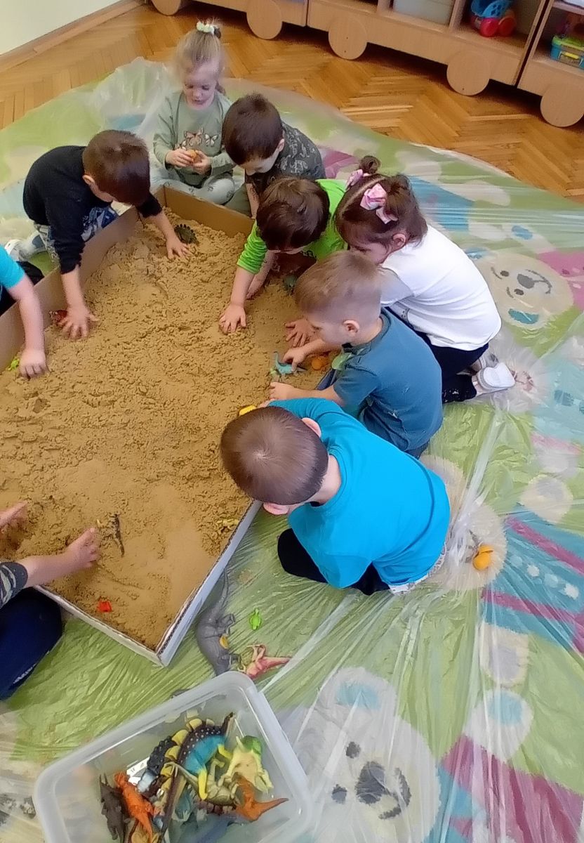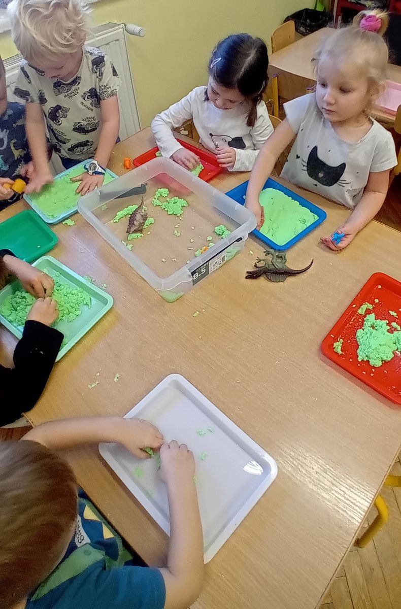 Najmłodsze dzieci poznawały dinozaury poprzez zabawy rozwijające spostrzegawczość i zmysły. Układały puzzle oraz grały w memory obrazkowe, ćwicząc pamięć i koncentrację. W zabawach sensorycznych z piaskiem kinetycznym i naturalnym wyszukiwały ukryte figurki dinozaurów, wcielając się w małych odkrywców. Duże wrażenie zrobiło doświadczenie „Wulkan”, które w prosty i atrakcyjny sposób przybliżyło dzieciom zjawiska przyrodnicze. Kolorowanie ilustracji oraz segregowanie figurek według kolorów pozwoliło utrwalić umiejętność klasyfikowania i rozwijać sprawność manualną.
