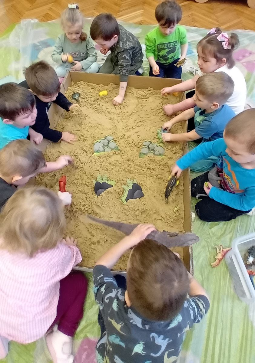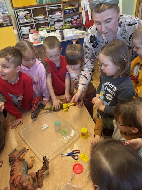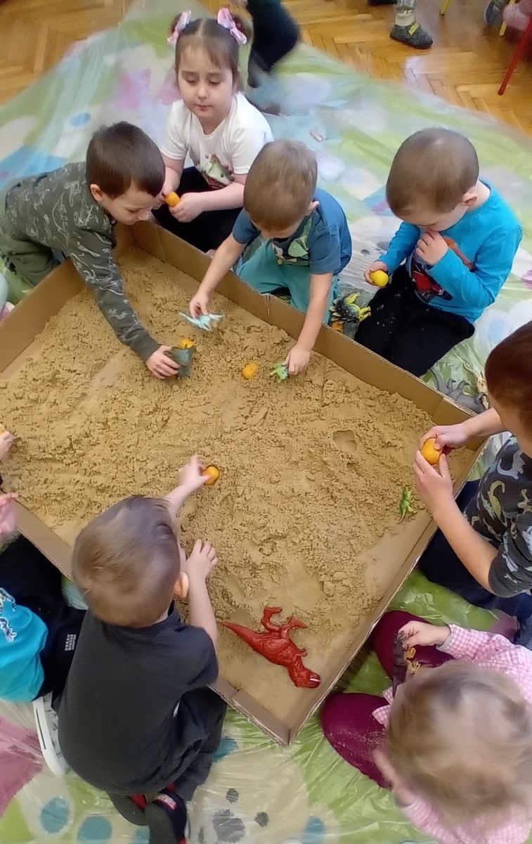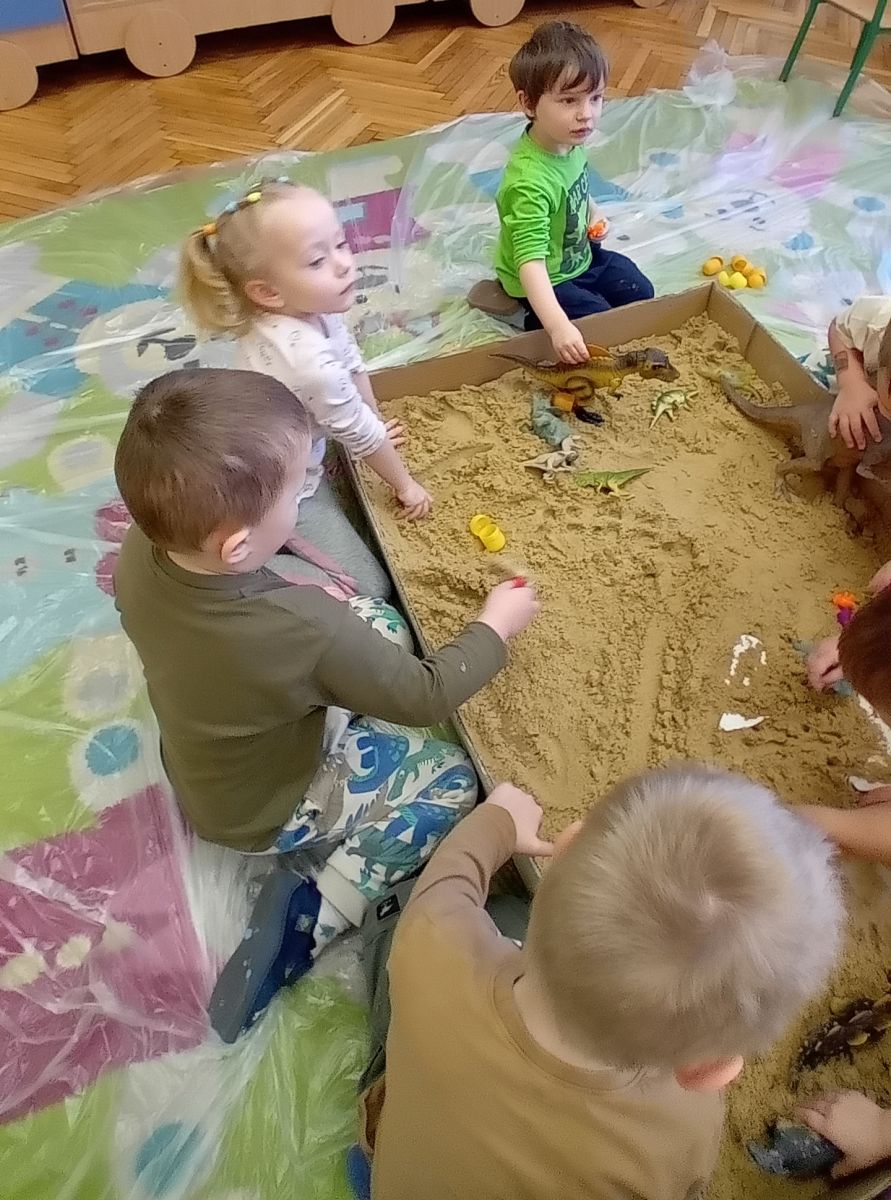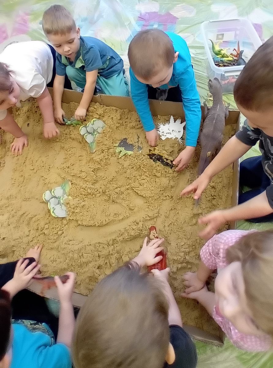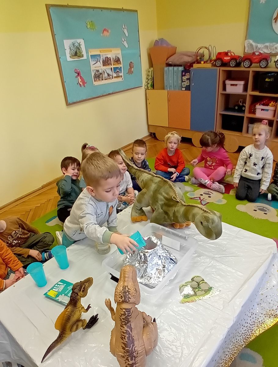 Najmłodsze dzieci poznawały dinozaury poprzez zabawy rozwijające spostrzegawczość i zmysły. Układały puzzle oraz grały w memory obrazkowe, ćwicząc pamięć i koncentrację. W zabawach sensorycznych z piaskiem kinetycznym i naturalnym wyszukiwały ukryte figurki dinozaurów, wcielając się w małych odkrywców. Duże wrażenie zrobiło doświadczenie „Wulkan”, które w prosty i atrakcyjny sposób przybliżyło dzieciom zjawiska przyrodnicze. Kolorowanie ilustracji oraz segregowanie figurek według kolorów pozwoliło utrwalić umiejętność klasyfikowania i rozwijać sprawność manualną.