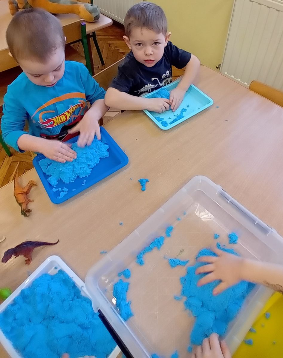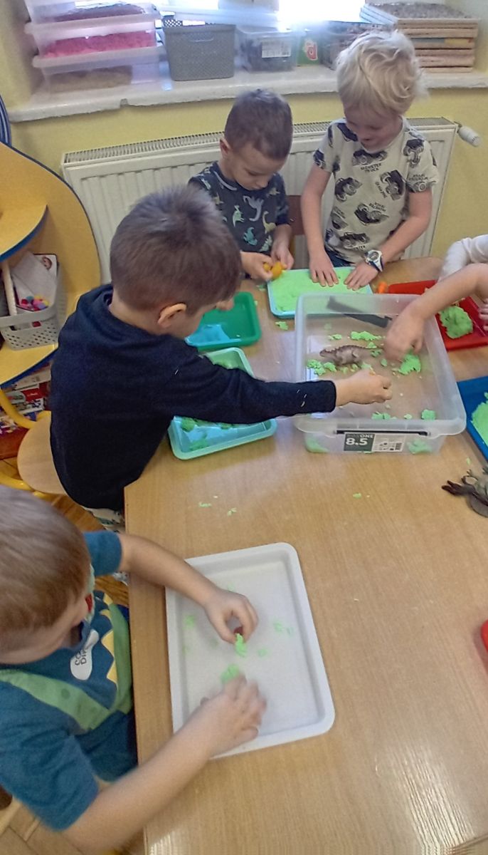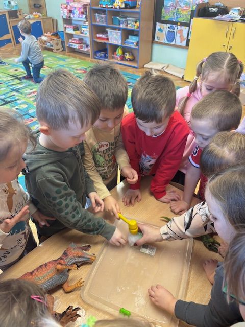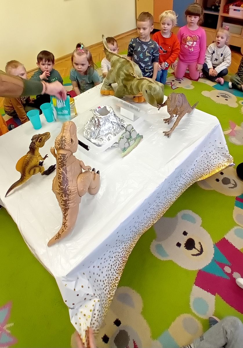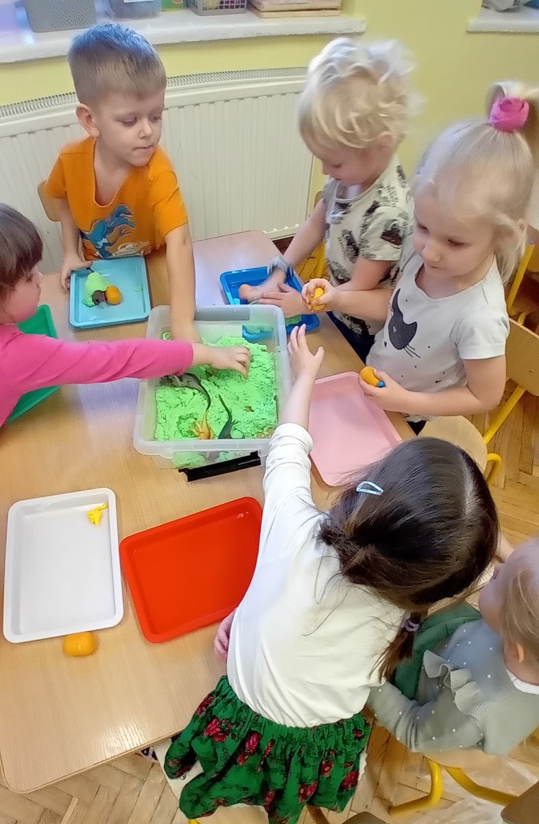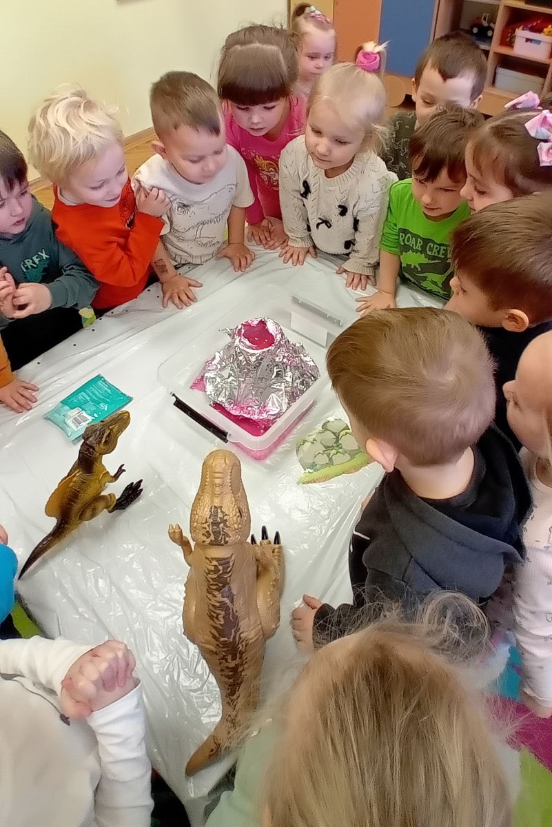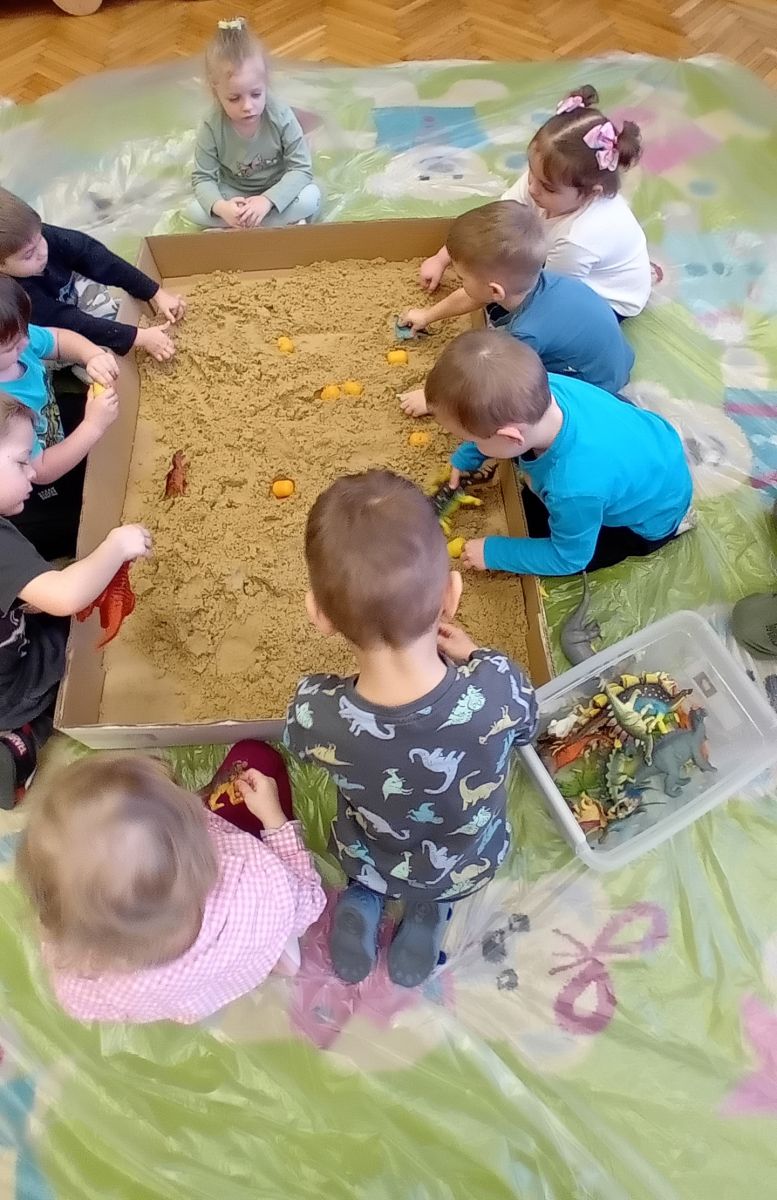 Najmłodsze dzieci poznawały dinozaury poprzez zabawy rozwijające spostrzegawczość i zmysły. Układały puzzle oraz grały w memory obrazkowe, ćwicząc pamięć i koncentrację. W zabawach sensorycznych z piaskiem kinetycznym i naturalnym wyszukiwały ukryte figurki dinozaurów, wcielając się w małych odkrywców. Duże wrażenie zrobiło doświadczenie „Wulkan”, które w prosty i atrakcyjny sposób przybliżyło dzieciom zjawiska przyrodnicze. Kolorowanie ilustracji oraz segregowanie figurek według kolorów pozwoliło utrwalić umiejętność klasyfikowania i rozwijać sprawność manualną.
