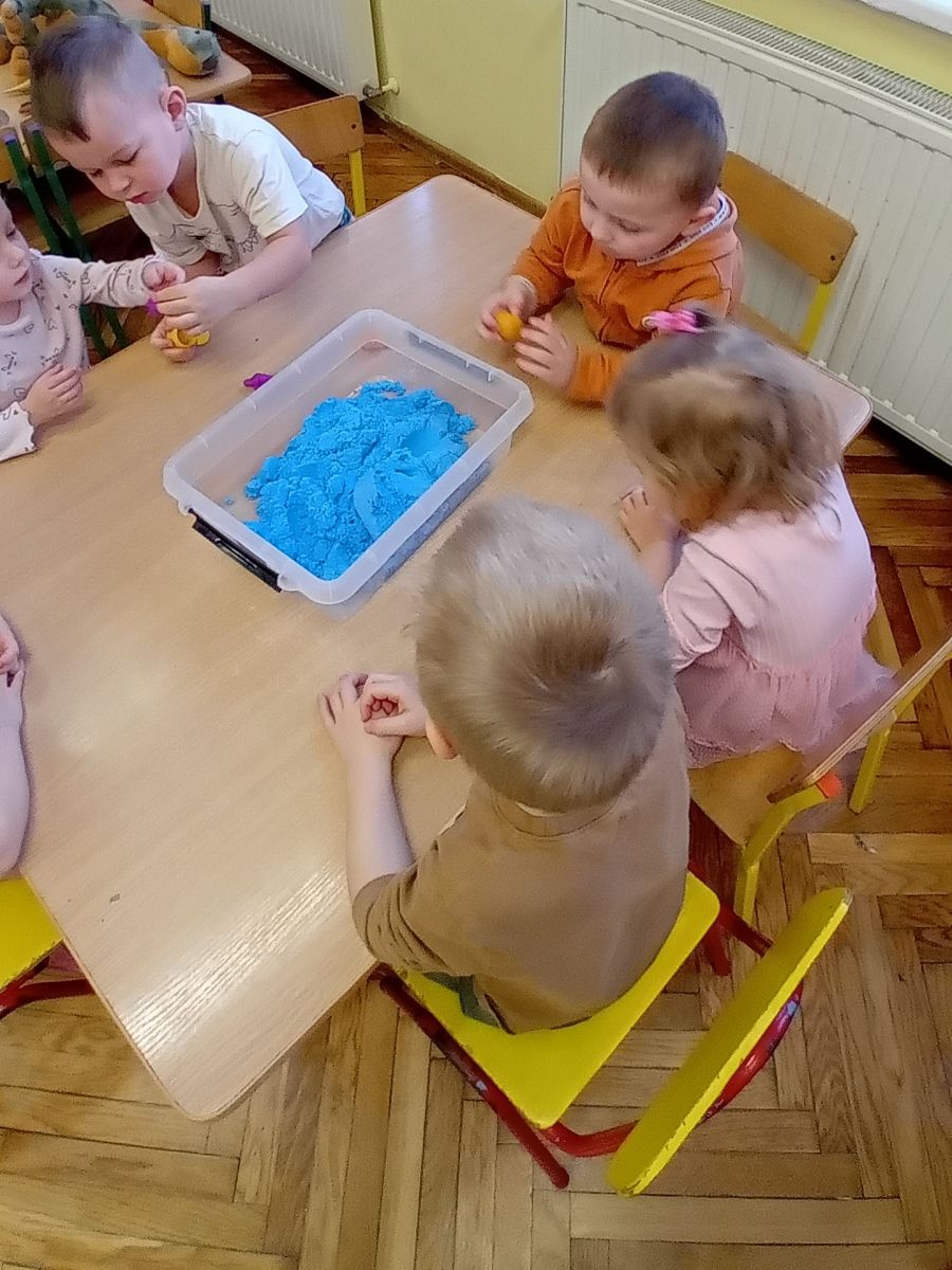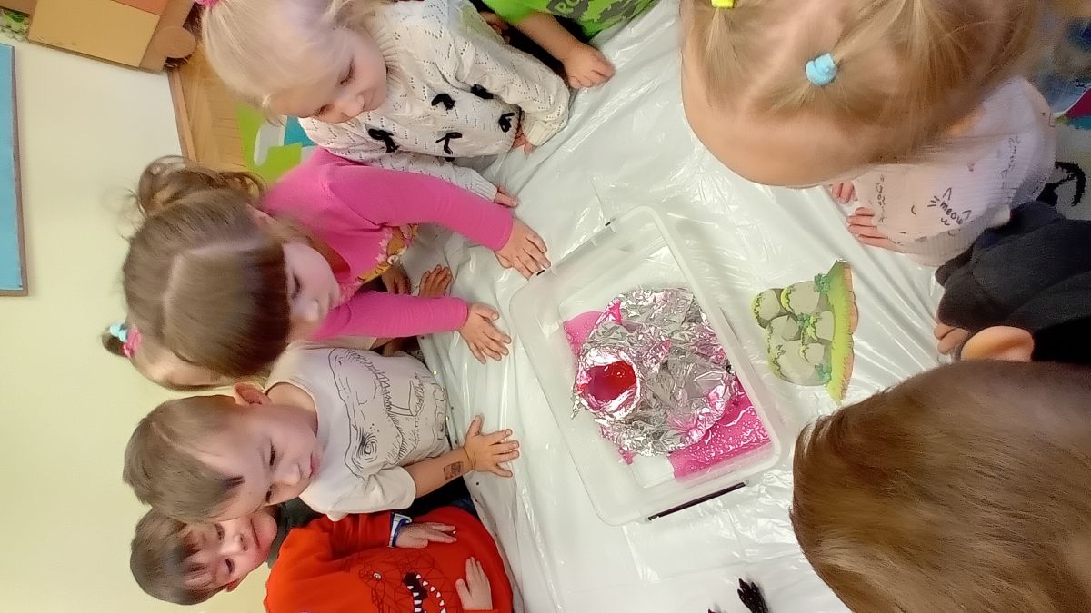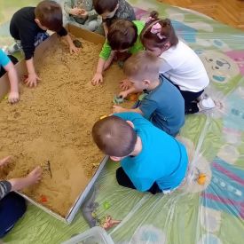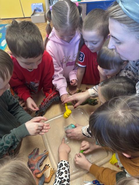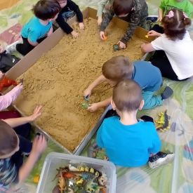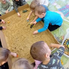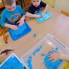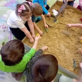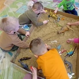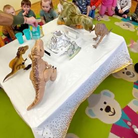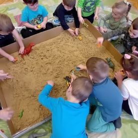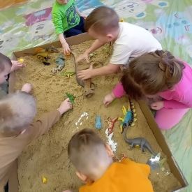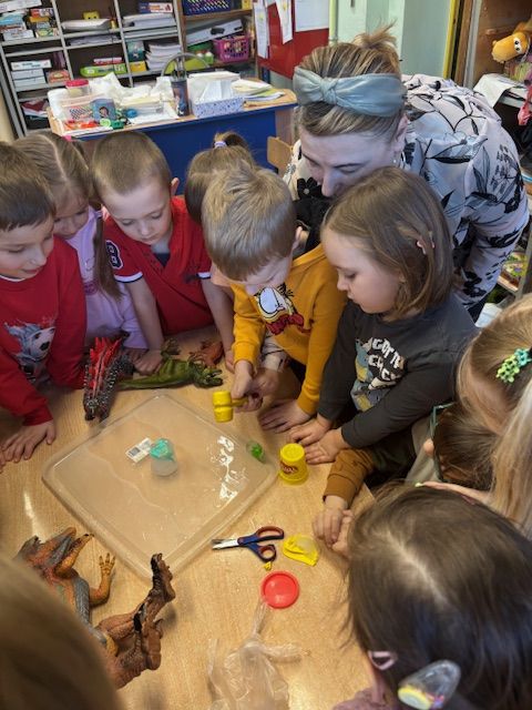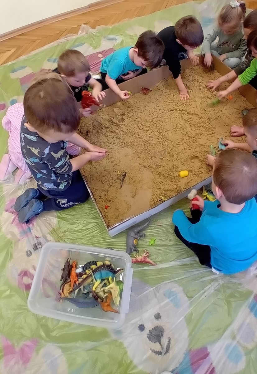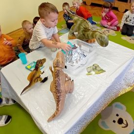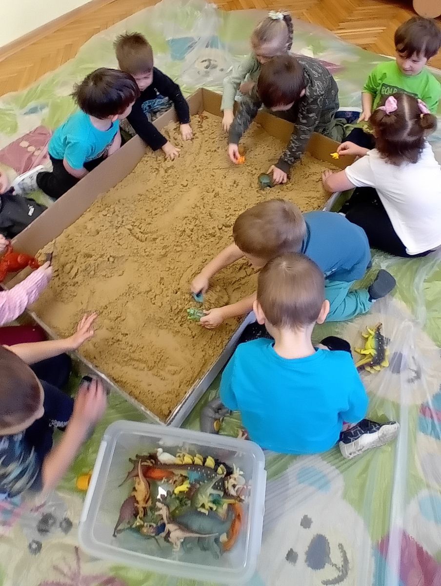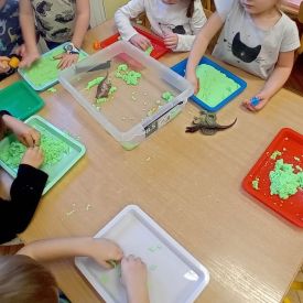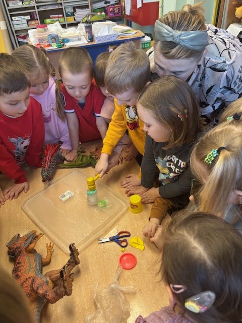 Najmłodsze dzieci poznawały dinozaury poprzez zabawy rozwijające spostrzegawczość i zmysły. Układały puzzle oraz grały w memory obrazkowe, ćwicząc pamięć i koncentrację. W zabawach sensorycznych z piaskiem kinetycznym i naturalnym wyszukiwały ukryte figurki dinozaurów, wcielając się w małych odkrywców. Duże wrażenie zrobiło doświadczenie „Wulkan”, które w prosty i atrakcyjny sposób przybliżyło dzieciom zjawiska przyrodnicze. Kolorowanie ilustracji oraz segregowanie figurek według kolorów pozwoliło utrwalić umiejętność klasyfikowania i rozwijać sprawność manualną.