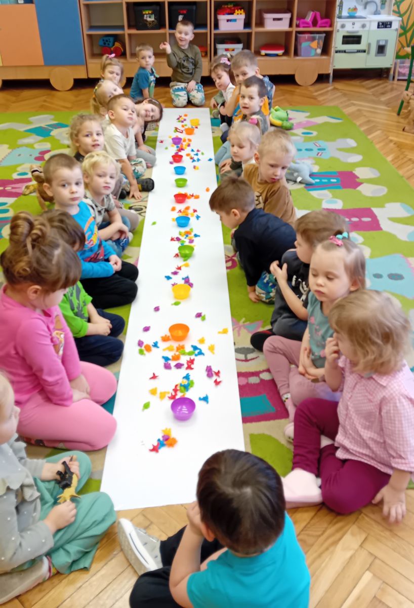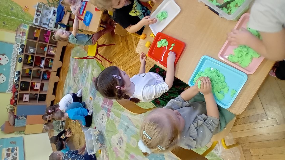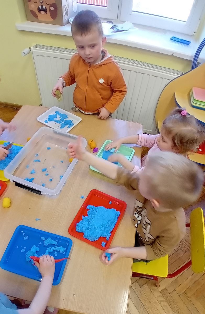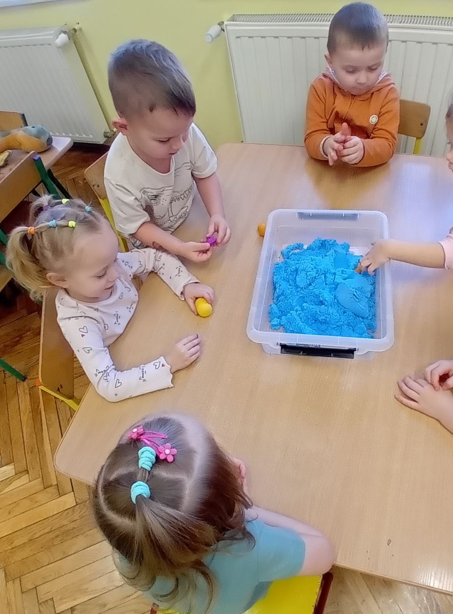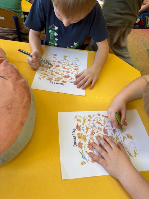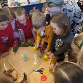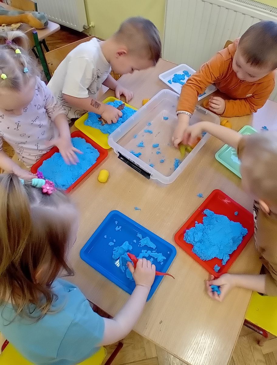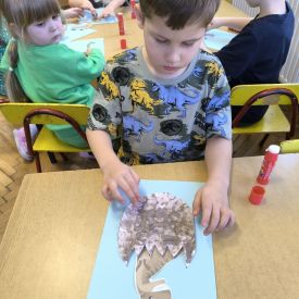Najmłodsze dzieci poznawały dinozaury poprzez zabawy rozwijające spostrzegawczość i zmysły. Układały puzzle oraz grały w memory obrazkowe, ćwicząc pamięć i koncentrację. W zabawach sensorycznych z piaskiem kinetycznym i naturalnym wyszukiwały ukryte figurki dinozaurów, wcielając się w małych odkrywców. Duże wrażenie zrobiło doświadczenie „Wulkan”, które w prosty i atrakcyjny sposób przybliżyło dzieciom zjawiska przyrodnicze. Kolorowanie ilustracji oraz segregowanie figurek według kolorów pozwoliło utrwalić umiejętność klasyfikowania i rozwijać sprawność manualną.