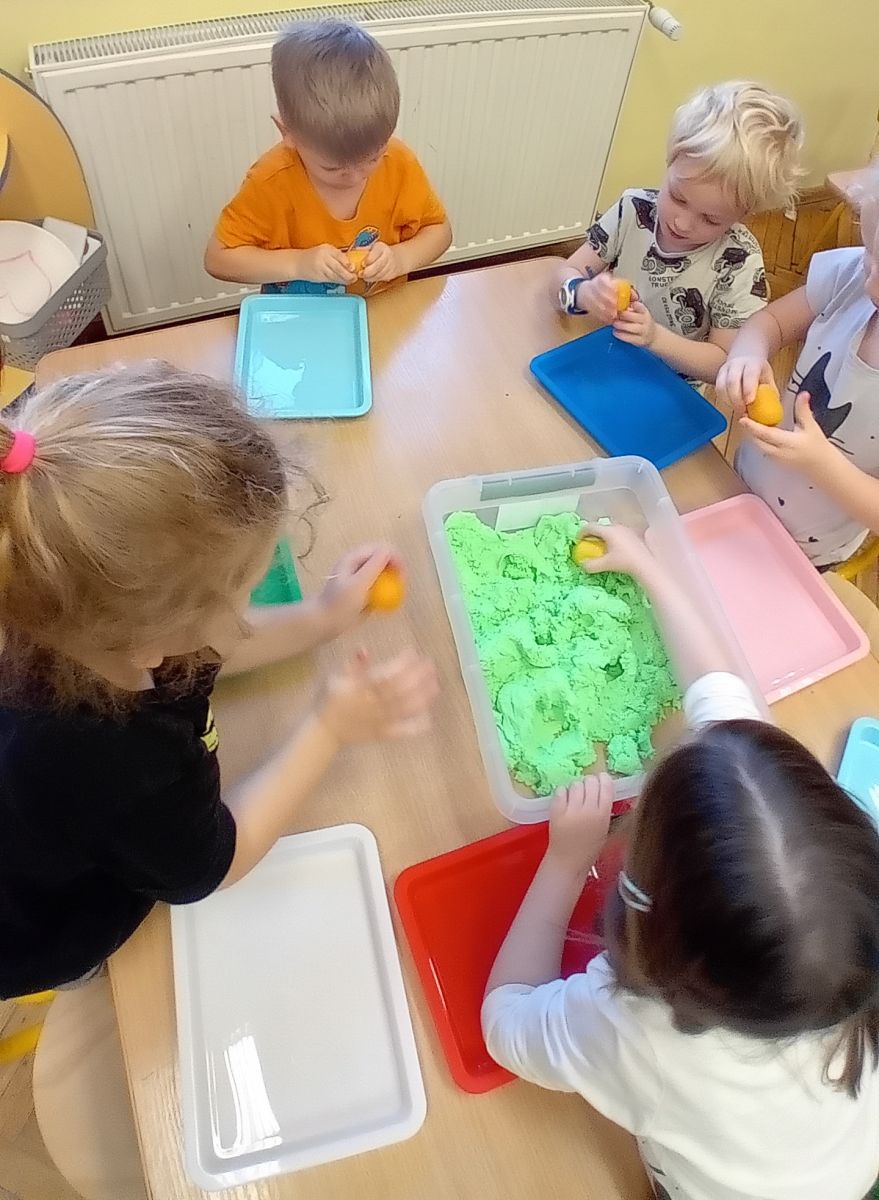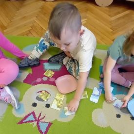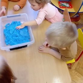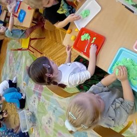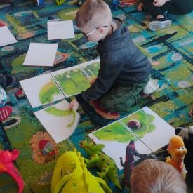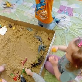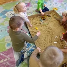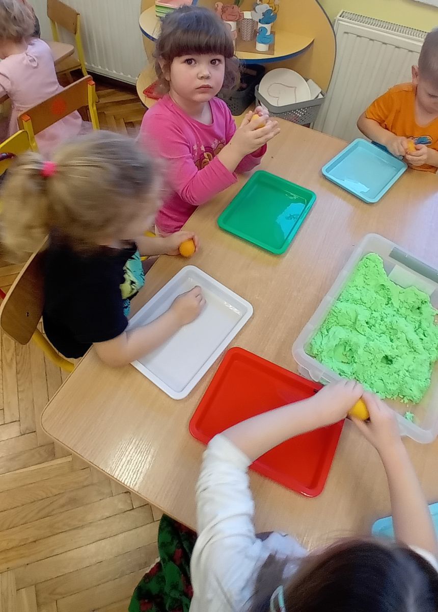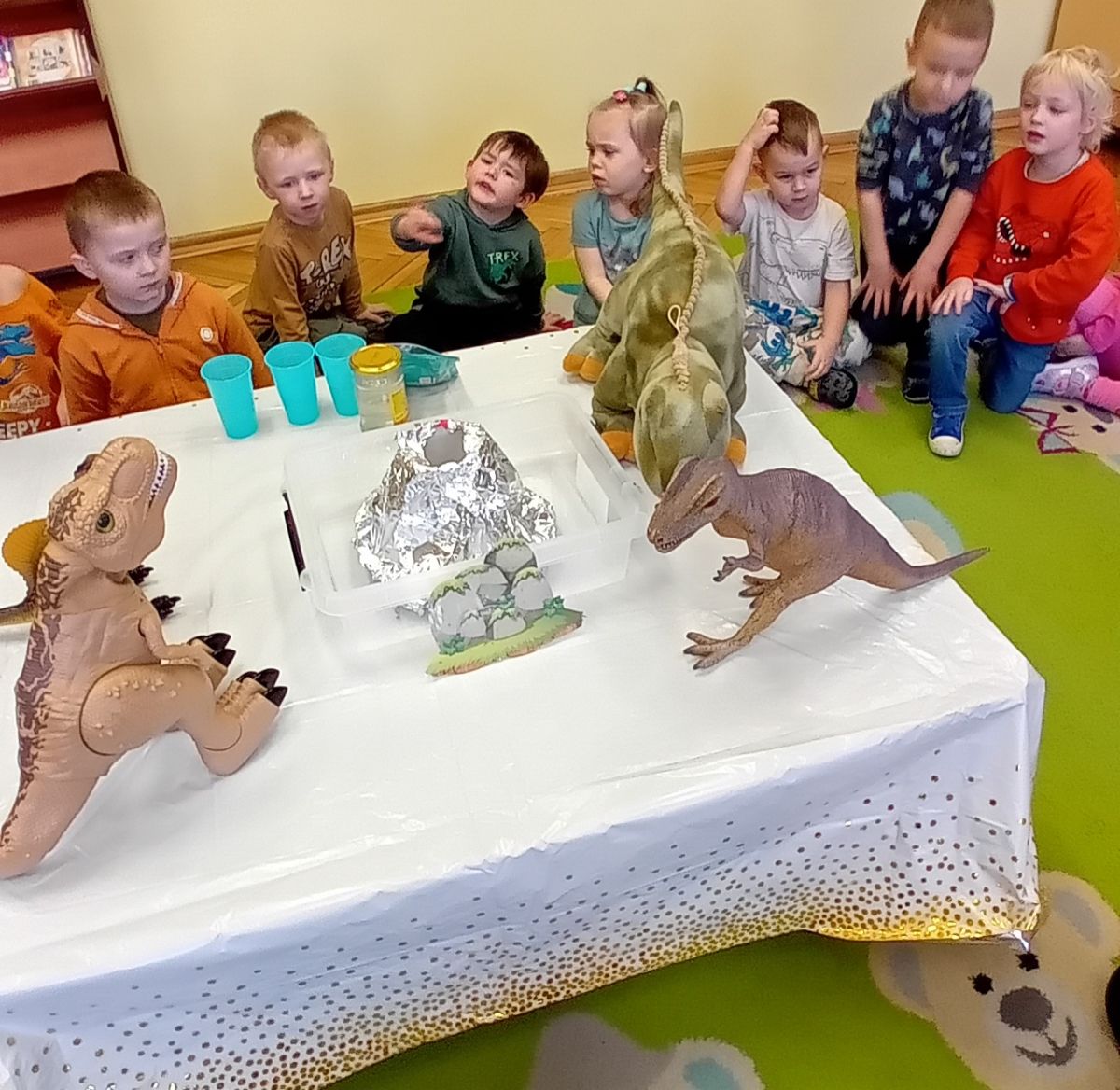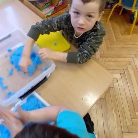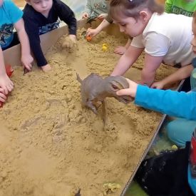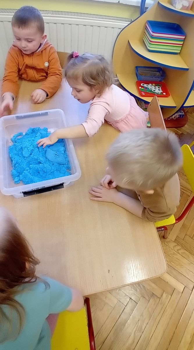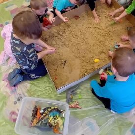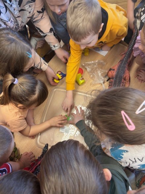 Najmłodsze dzieci poznawały dinozaury poprzez zabawy rozwijające spostrzegawczość i zmysły. Układały puzzle oraz grały w memory obrazkowe, ćwicząc pamięć i koncentrację. W zabawach sensorycznych z piaskiem kinetycznym i naturalnym wyszukiwały ukryte figurki dinozaurów, wcielając się w małych odkrywców. Duże wrażenie zrobiło doświadczenie „Wulkan”, które w prosty i atrakcyjny sposób przybliżyło dzieciom zjawiska przyrodnicze. Kolorowanie ilustracji oraz segregowanie figurek według kolorów pozwoliło utrwalić umiejętność klasyfikowania i rozwijać sprawność manualną.