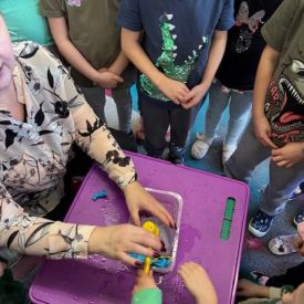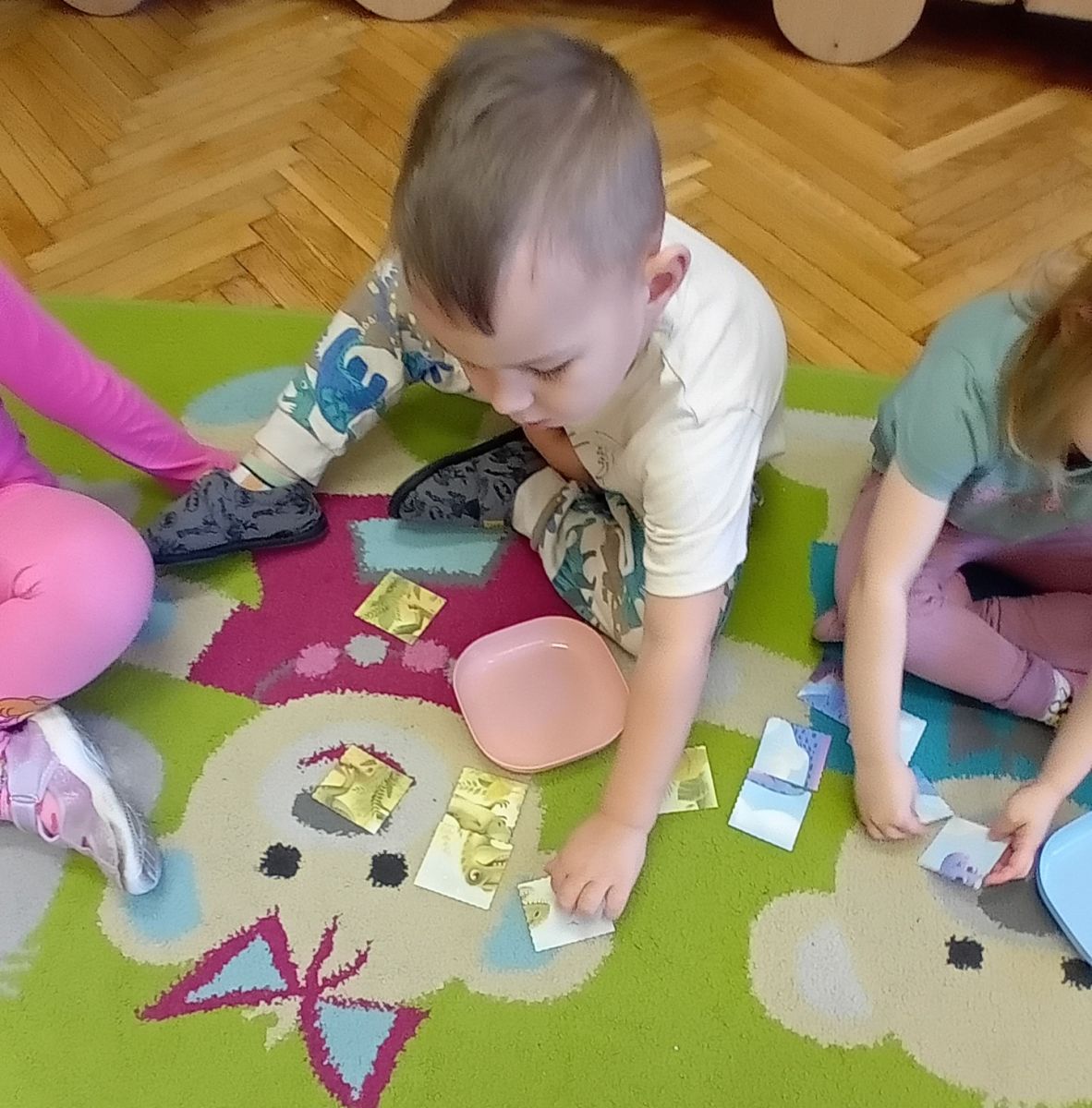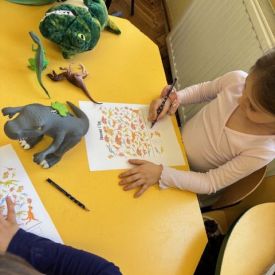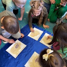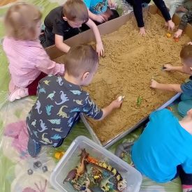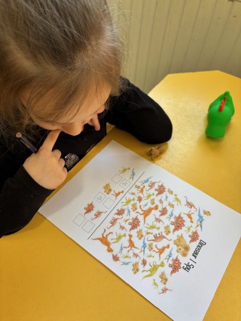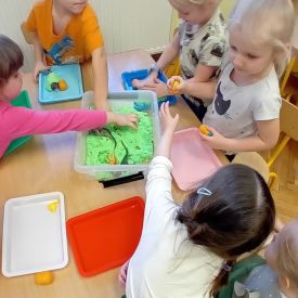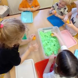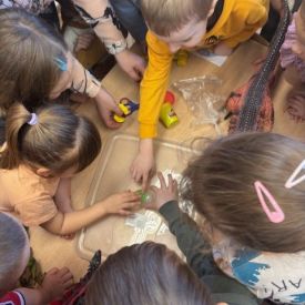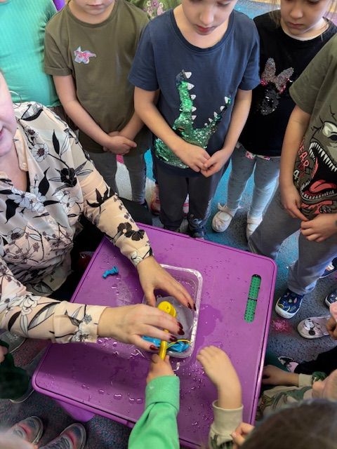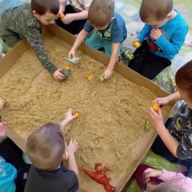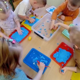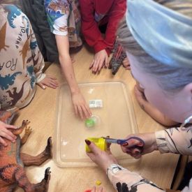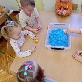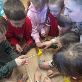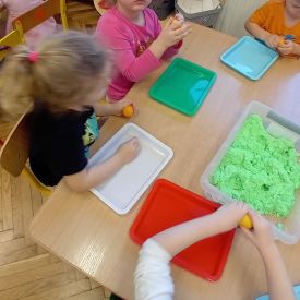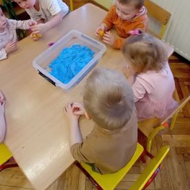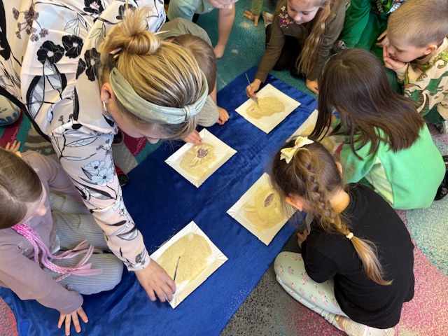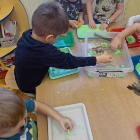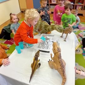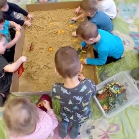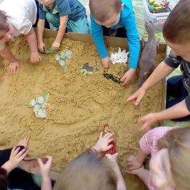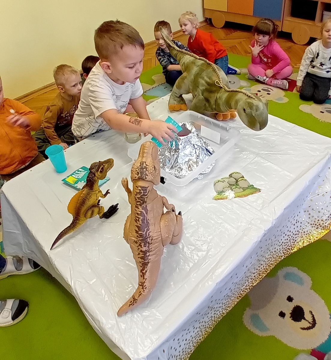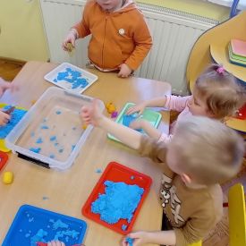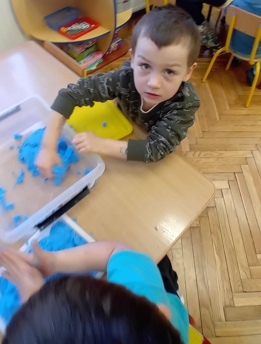 Najmłodsze dzieci poznawały dinozaury poprzez zabawy rozwijające spostrzegawczość i zmysły. Układały puzzle oraz grały w memory obrazkowe, ćwicząc pamięć i koncentrację. W zabawach sensorycznych z piaskiem kinetycznym i naturalnym wyszukiwały ukryte figurki dinozaurów, wcielając się w małych odkrywców. Duże wrażenie zrobiło doświadczenie „Wulkan”, które w prosty i atrakcyjny sposób przybliżyło dzieciom zjawiska przyrodnicze. Kolorowanie ilustracji oraz segregowanie figurek według kolorów pozwoliło utrwalić umiejętność klasyfikowania i rozwijać sprawność manualną.
