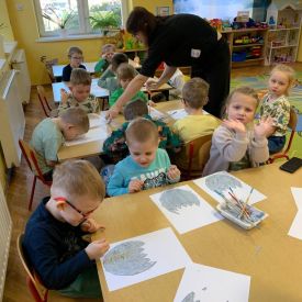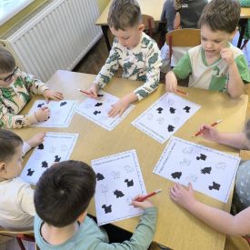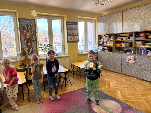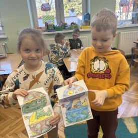 Dzieci z grupy drugiej zgłębiały tajemnice życia dinozaurów. Podczas zabawy z latarką „Co jedzą dinozaury?” odkrywały, które z nich były roślinożerne, a które drapieżne. Ta forma aktywności rozbudzała ciekawość i zachęcała do zadawania pytań. Przedszkolaki wykonały również barwne prace plastyczne przedstawiające dinozaury, rozwijając wyobraźnię i kreatywność. Zwieńczeniem dnia były zabawy muzyczno-ruchowe, podczas których dzieci poruszały się jak ogromne gady, reagując na tempo i charakter muzyki.