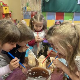 • Lały wosk przez klucz – przedszkolaki obserwowały powstałe kształty niczym prawdziwi czarodzieje i wróżki, próbując odgadnąć ich znaczenie.